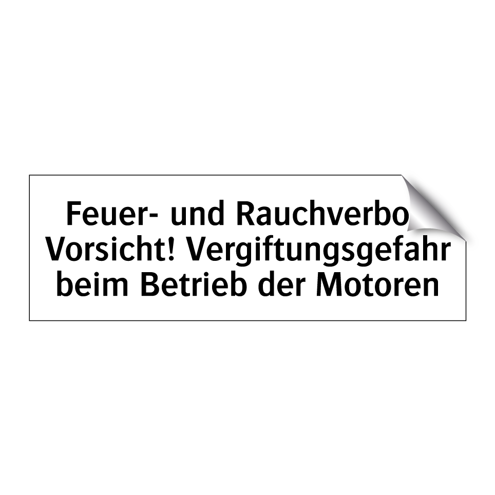 Verbotsschild mit dem Text Feuer- und Rauchverbot. Vorsicht! Vergiftungsgefahr beim Betrieb der Motoren