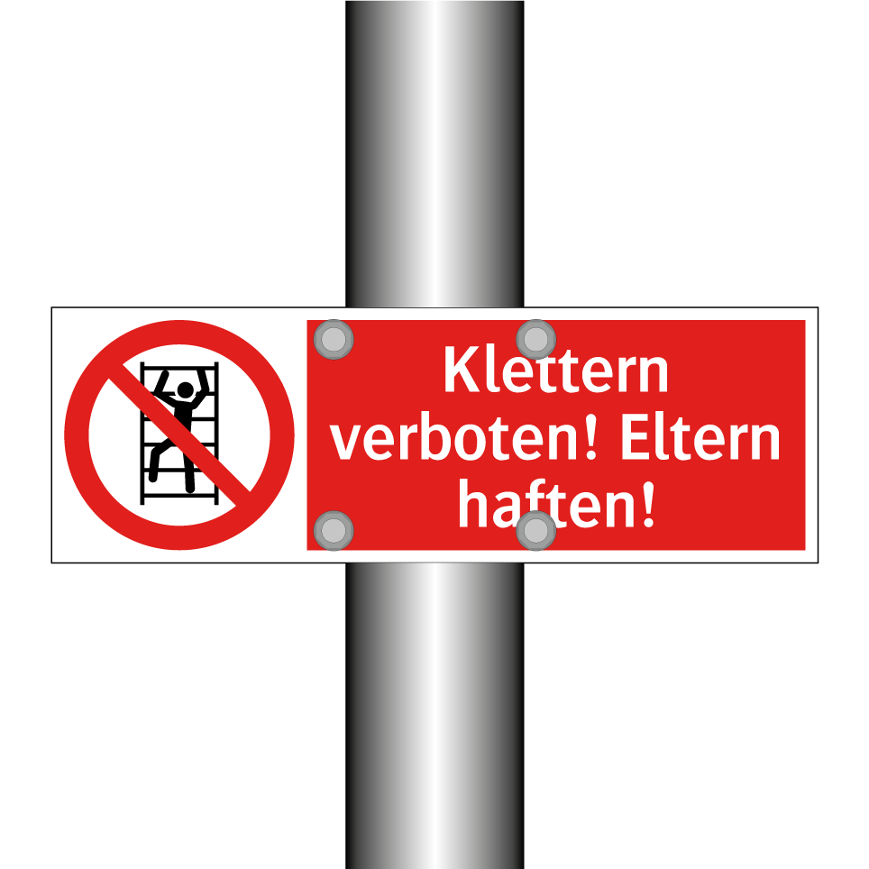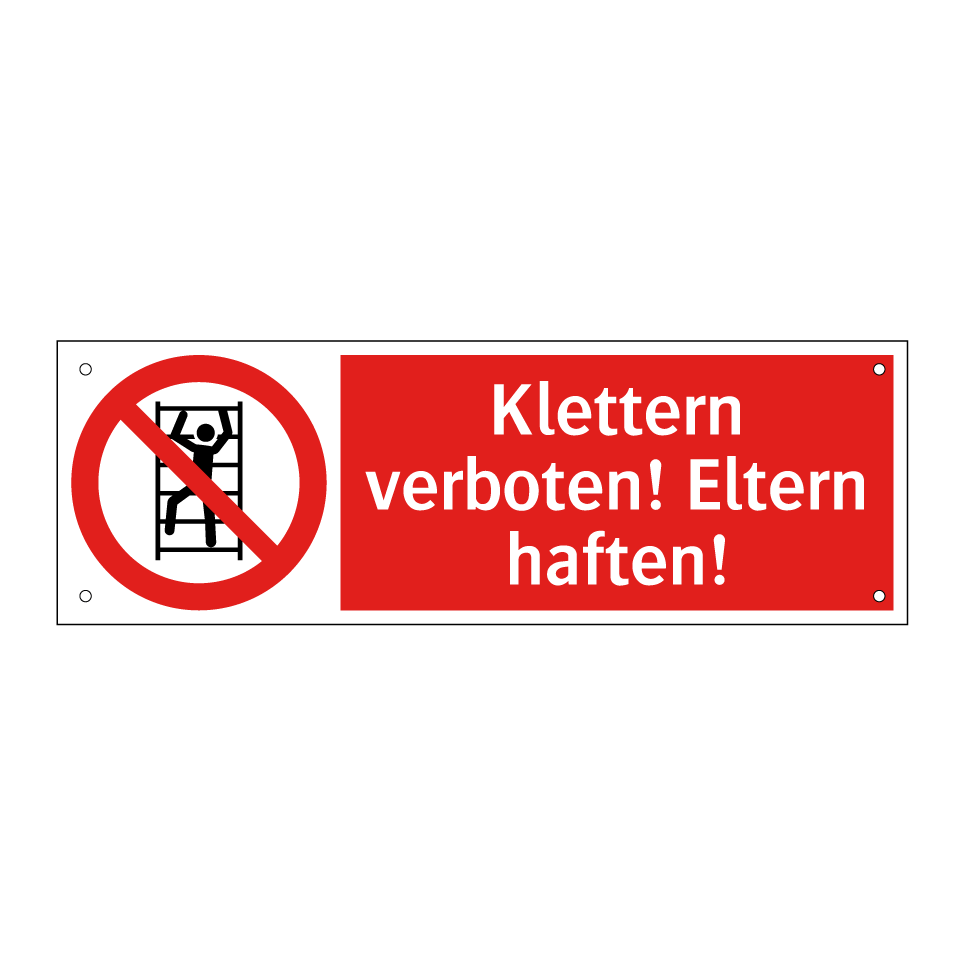 Verbotsschild mit dem Text Klettern verboten! Eltern haften!