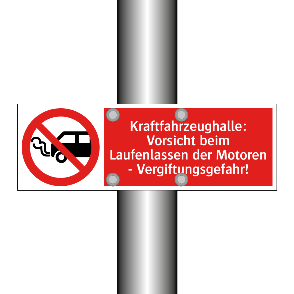 Verbotsschild mit dem Text Kraftfahrzeughalle: Vorsicht beim Laufenlassen der Motoren - Vergiftungsgefahr!