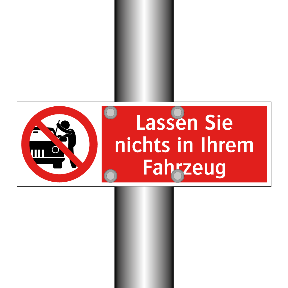 Verbotsschild mit dem Text Lassen Sie nichts in Ihrem Fahrzeug