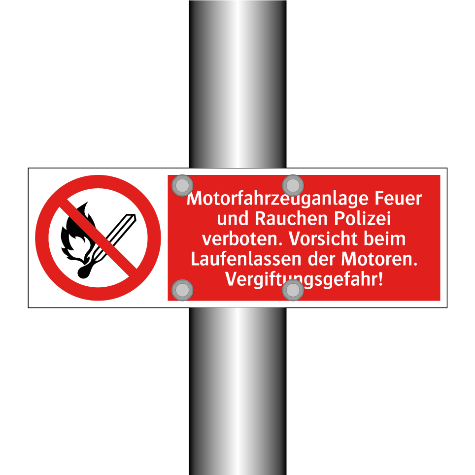 Verbotsschild mit dem Text Motorfahrzeuganlage Feuer und Rauchen Polizei verboten. Vorsicht beim Laufenlassen der Motoren. Vergiftungsgefahr!