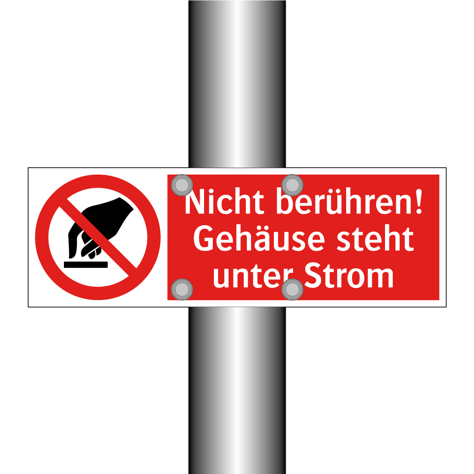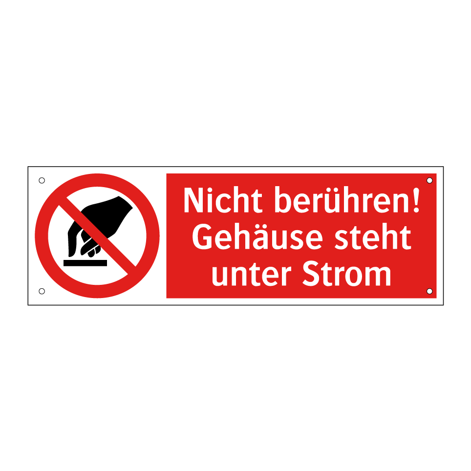 Verbotsschild mit dem Text Nicht berühren! Gehäuse steht unter Strom