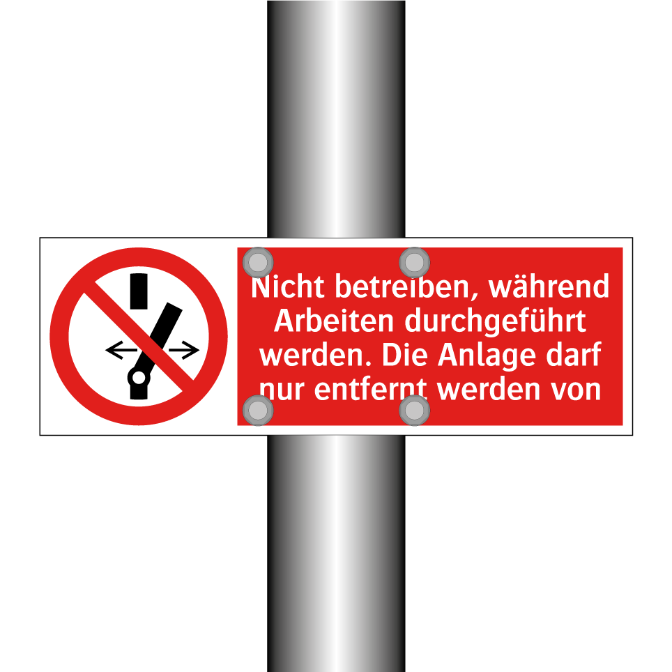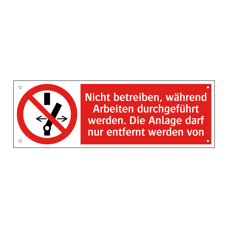 Verbotsschild mit dem Text Nicht betreiben, während Arbeiten durchgeführt werden. Die Anlage darf nur entfernt werden von