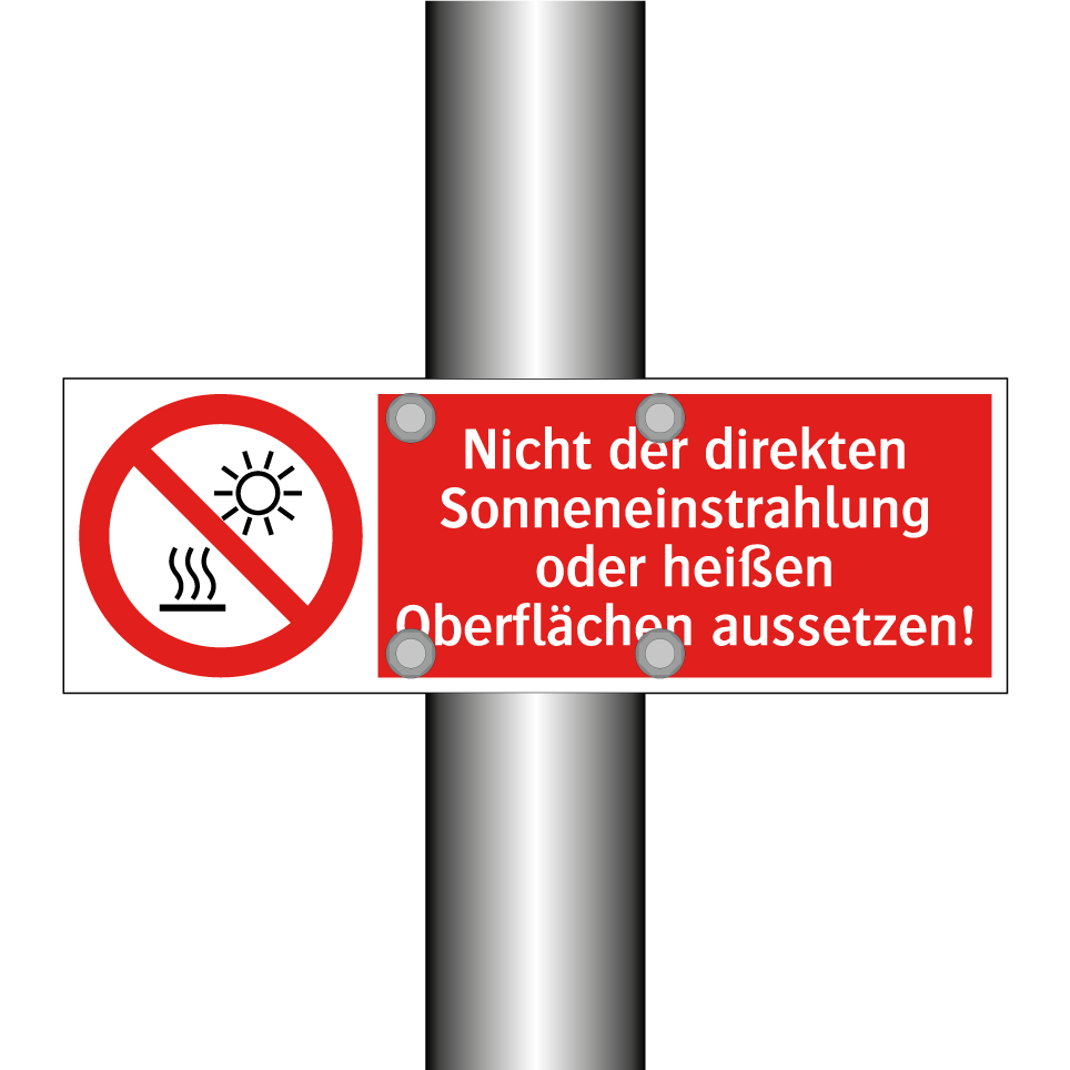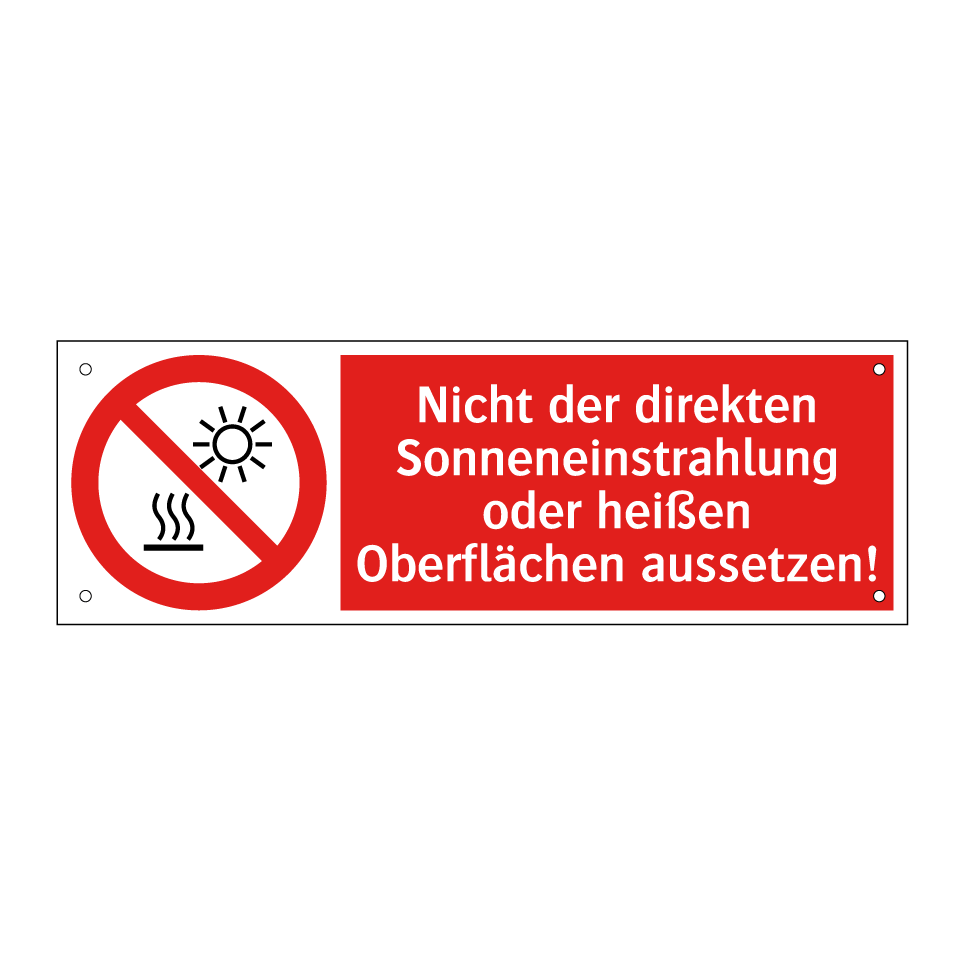 Verbotsschild mit dem Text Nicht der direkten Sonneneinstrahlung oder heißen Oberflächen aussetzen!