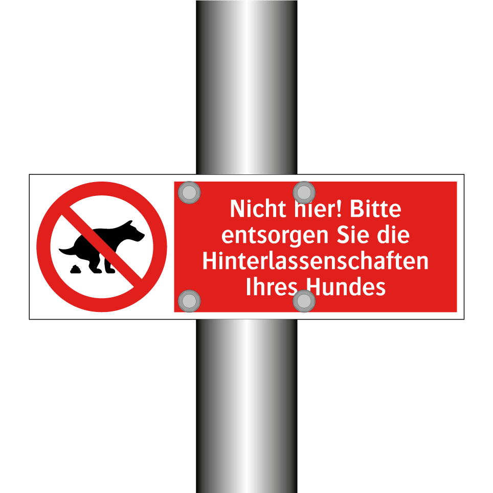 Verbotsschild mit dem Text Nicht hier! Bitte entsorgen Sie die Hinterlassenschaften Ihres Hundes