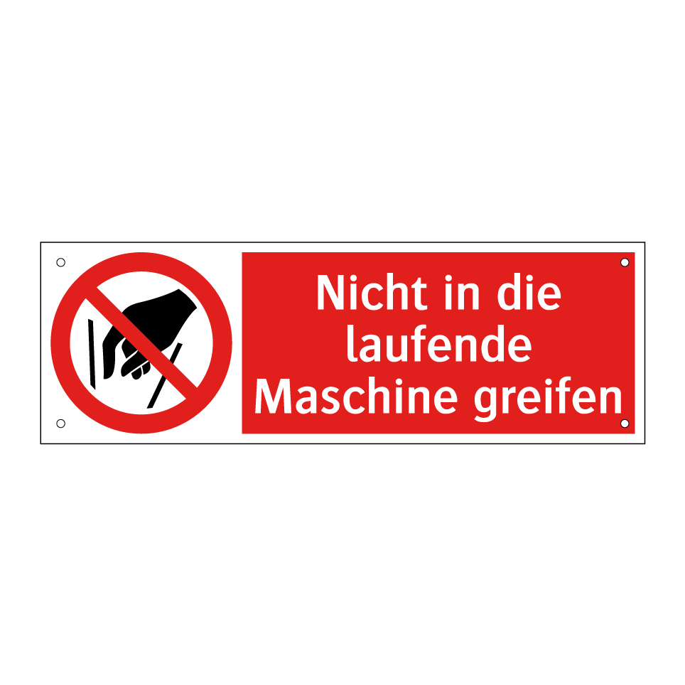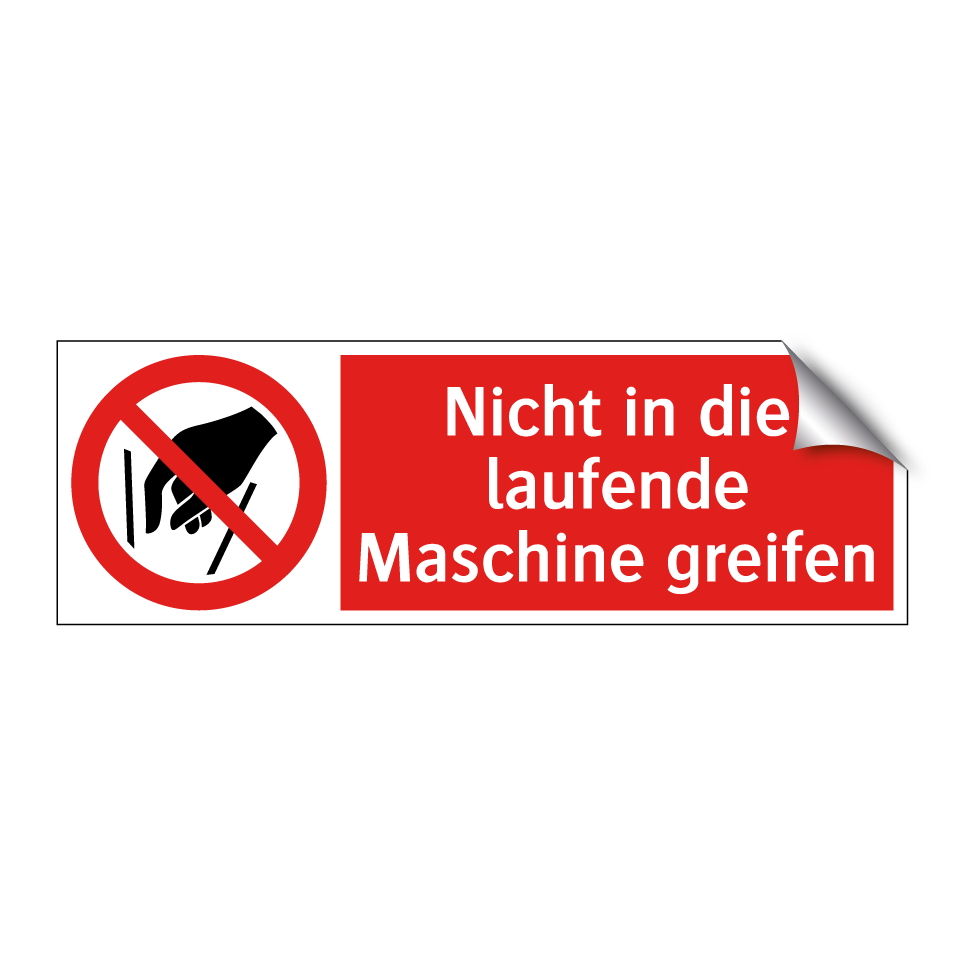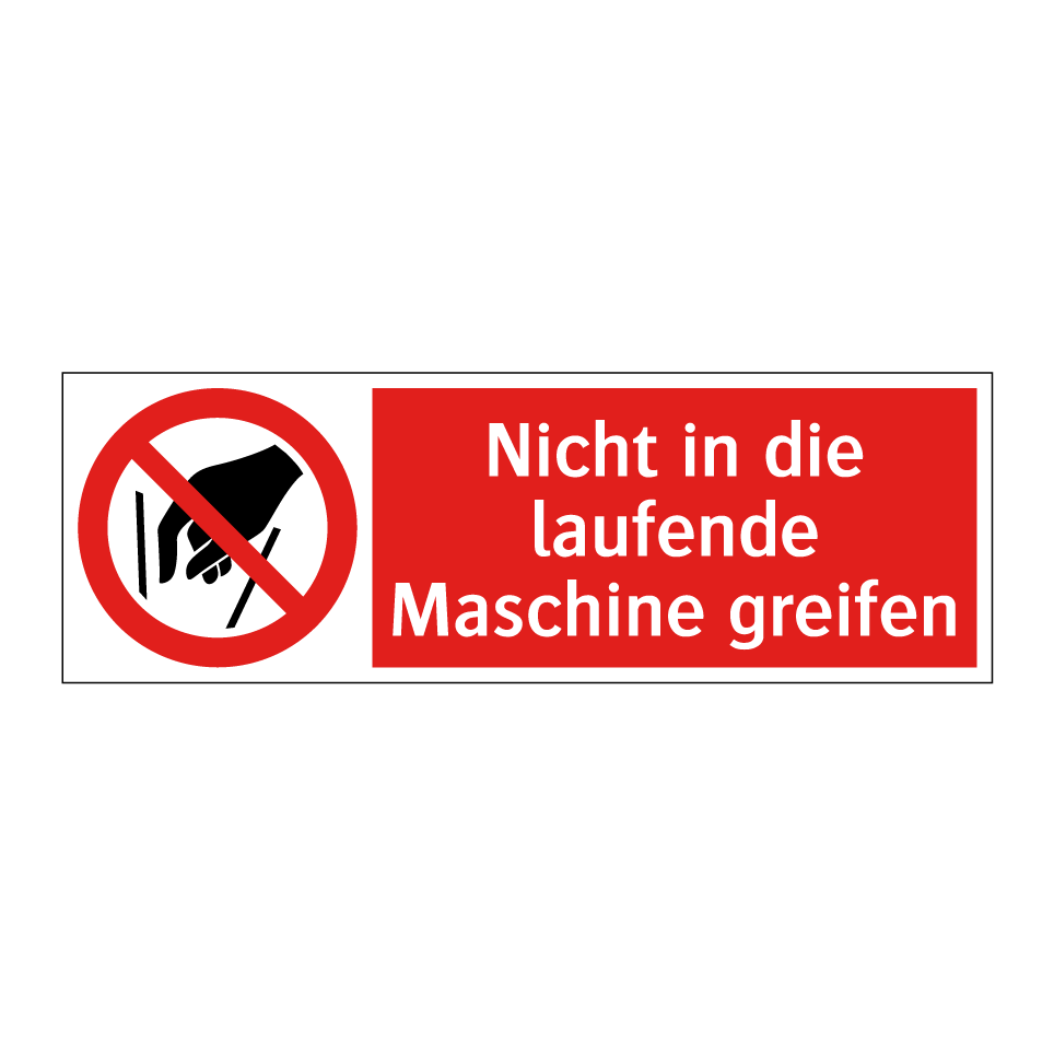 Verbotsschild mit dem Text Nicht in die laufende Maschine greifen