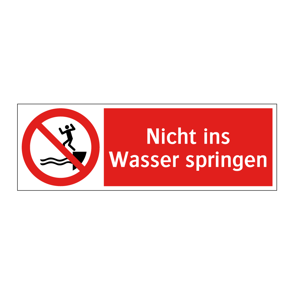 Diese auffällige Verbotsschild mit rotem Hintergrund und weißer Schrift ist ideal, um auf Gefahren in der Nähe von Gewässern hinzuweisen. Sie dient dazu, Menschen davor zu warnen, nicht ins Wasser zu springen, und trägt somit zur Sicherheit bei. Diese Verbotsschilder sind besonders nützlich an Orten wie Schwimmbädern, Seen, Flüssen oder anderen Wasserbereichen, wo das Springen ins Wasser ein Risiko darstellen könnte. Durch die klare Symbolik und die prägnante Botschaft wird die Aufmerksamkeit effektiv auf die potenzielle Gefahr gelenkt, was Unfälle verhindern kann. Platzieren Sie dieses Schild an gut sichtbaren Stellen, um die Sicherheit zu gewährleisten.