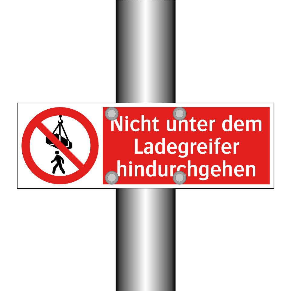 Verbotsschild mit dem Text Nicht unter dem Ladegreifer hindurchgehen