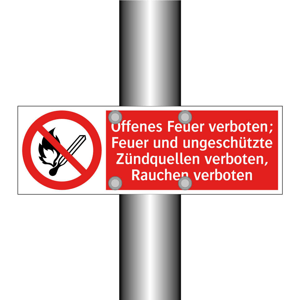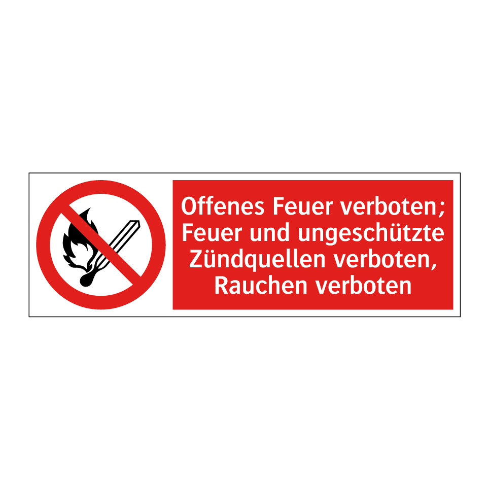 Verbotsschild mit dem Text Offenes Feuer verboten; Feuer und ungeschützte Zündquellen verboten, Rauchen verboten