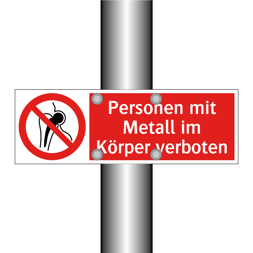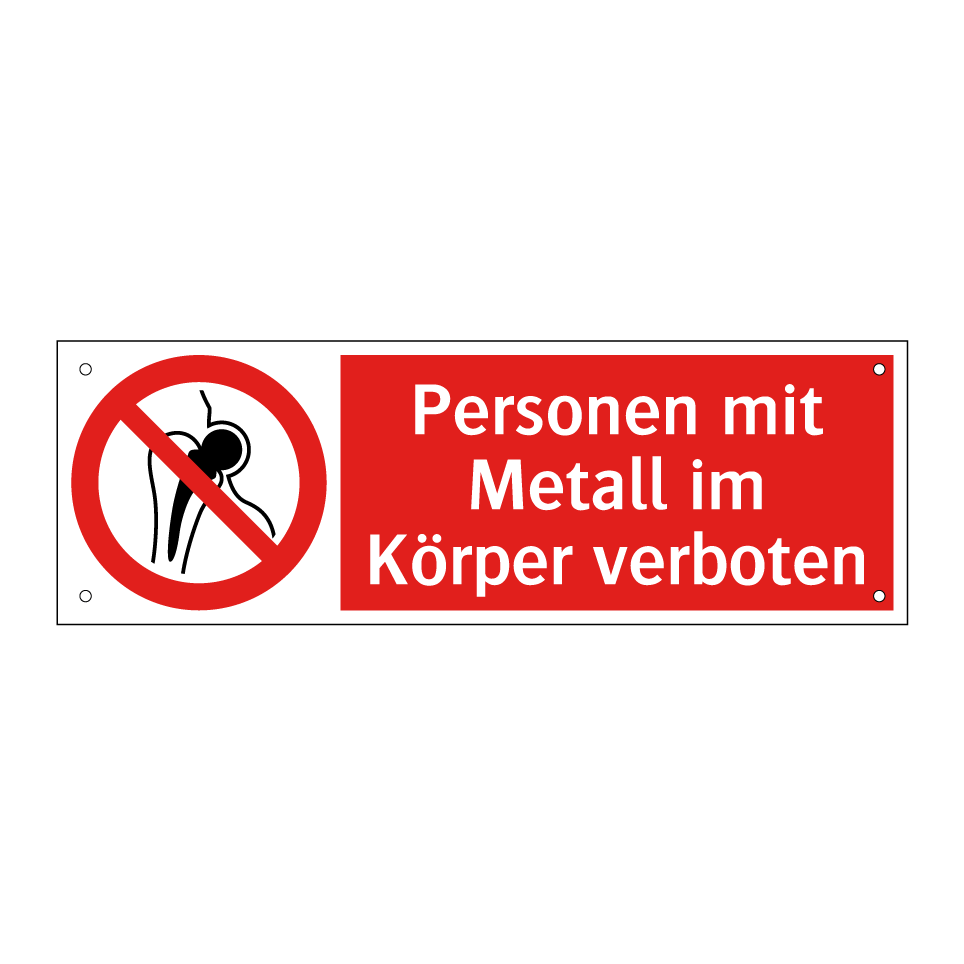 Verbotsschild mit dem Text Personen mit Metall im Körper verboten