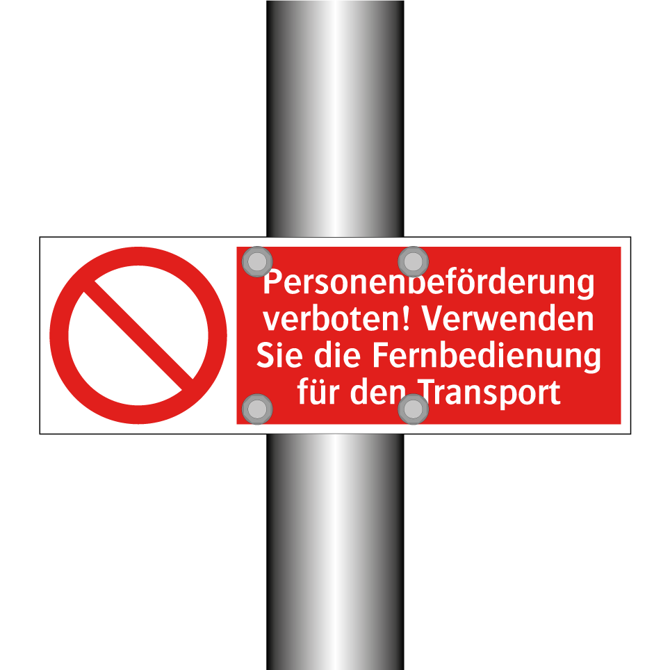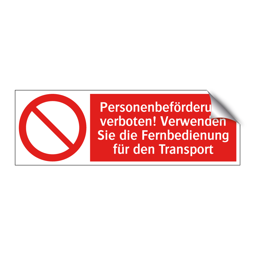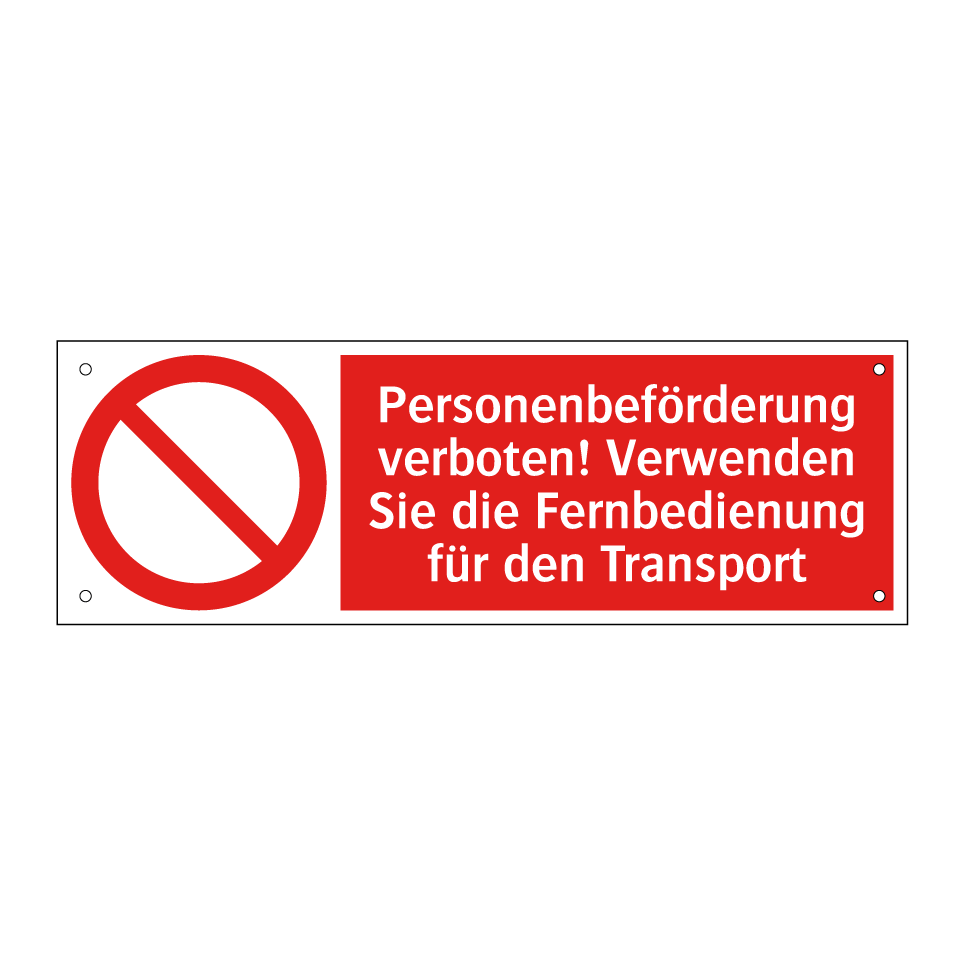 Verbotsschild mit dem Text Personenbeförderung verboten! Verwenden Sie die Fernbedienung für den Transport