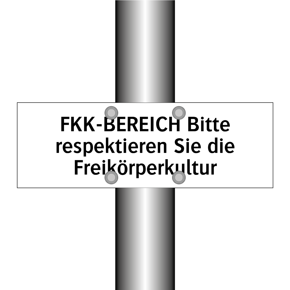 Verbotsschild mit dem Text FKK-BEREICH Bitte respektieren Sie die Freikörperkultur
