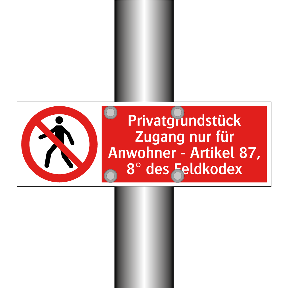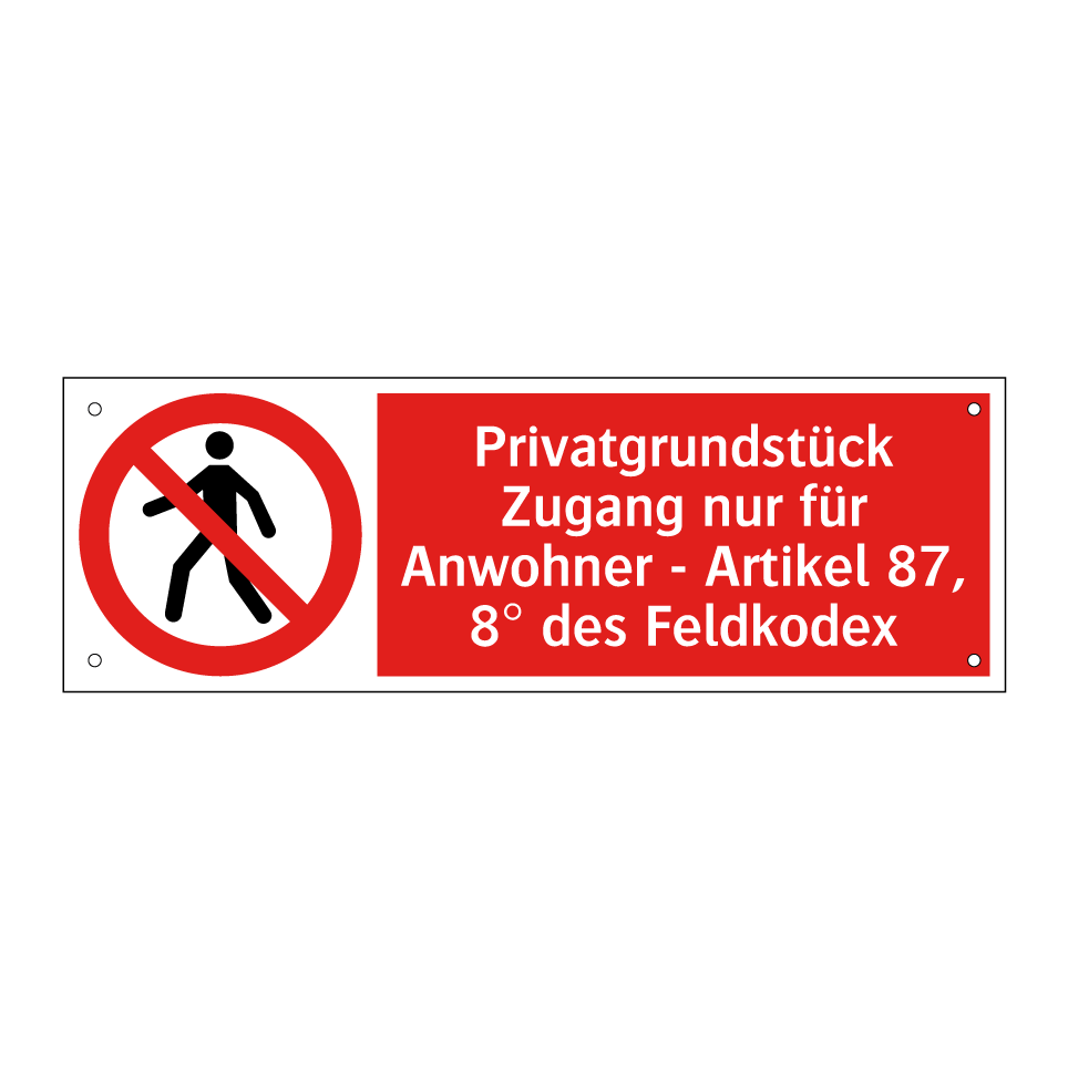 Verbotsschild mit dem Text Privatgrundstück Zugang nur für Anwohner - Artikel 87, 8° des Feldkodex