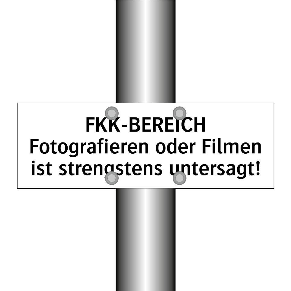 Verbotsschild mit dem Text FKK-BEREICH Fotografieren oder Filmen ist strengstens untersagt!