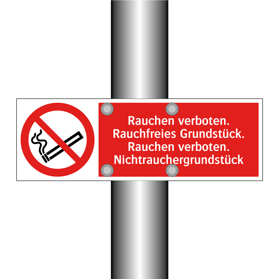 Verbotsschild mit dem Text Rauchen verboten. Rauchfreies Grundstück. Rauchen verboten. Nichtrauchergrundstück
