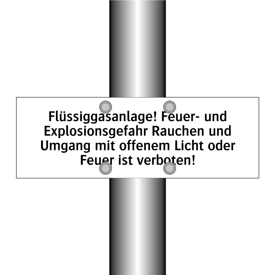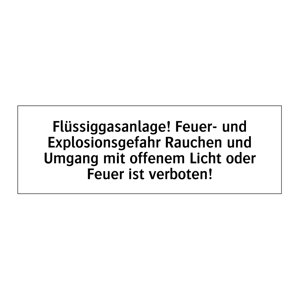 Verbotsschild mit dem Text Flüssiggasanlage! Feuer- und Explosionsgefahr Rauchen und Umgang mit offenem Licht oder Feuer ist verboten!
