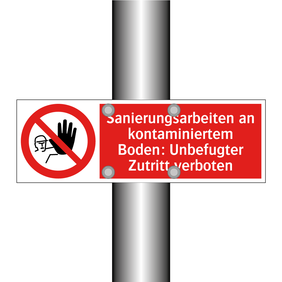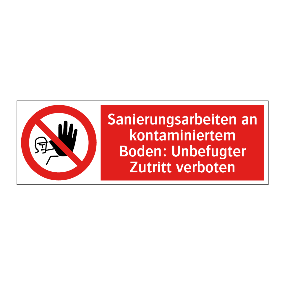 Verbotsschild mit dem Text Sanierungsarbeiten an kontaminiertem Boden: Unbefugter Zutritt verboten