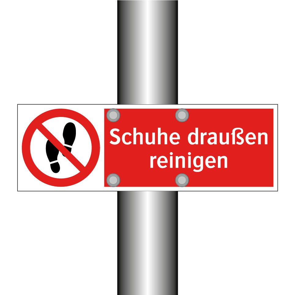 Verbotsschild mit dem Text Schuhe draußen reinigen