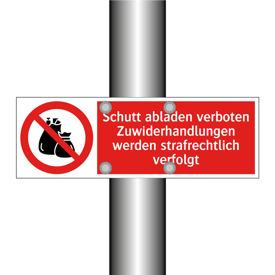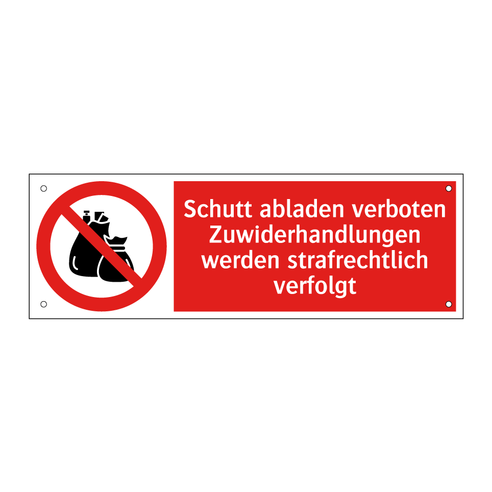 Verbotsschild mit dem Text Schutt abladen verboten Zuwiderhandlungen werden strafrechtlich verfolgt