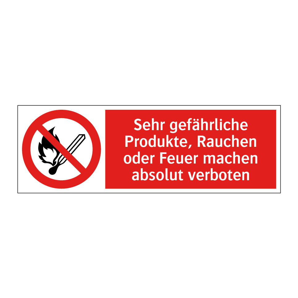 Verbotsschild mit dem Text Sehr gefährliche Produkte, Rauchen oder Feuer machen absolut verboten
