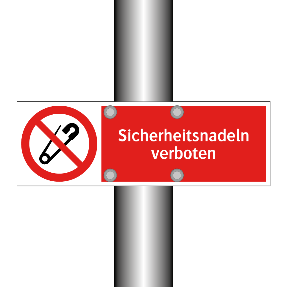 Verbotsschild mit dem Text Sicherheitsnadeln verboten
