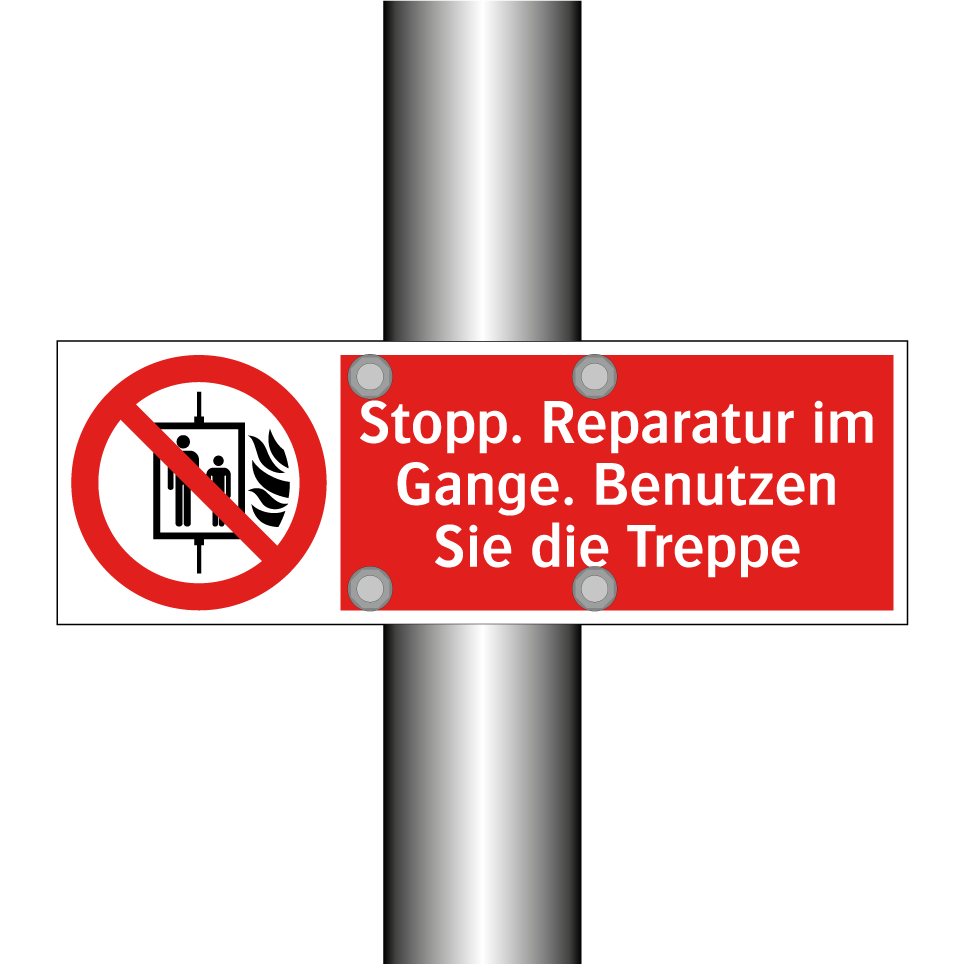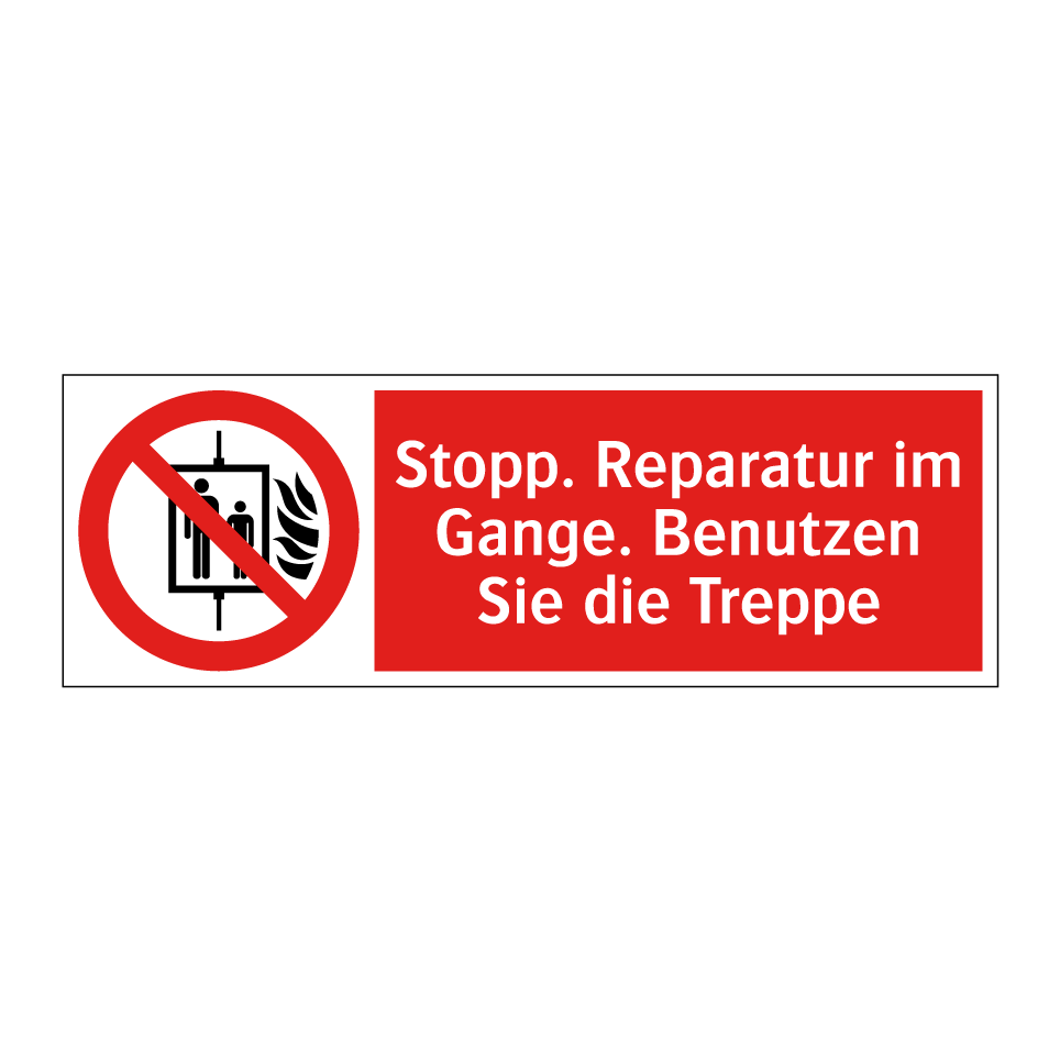 Diese auffällige Verbotsschild mit rotem Hintergrund und weißer Schrift ist ideal, um Bereiche zu kennzeichnen, die während Reparaturarbeiten nicht betreten werden sollten. Die klare Symbolik und der prägnante Text machen es einfach, die Botschaft zu verstehen und die Sicherheit zu gewährleisten. Diese Verbotsschilder sind besonders nützlich in Gebäuden, wo Aufzüge vorübergehend außer Betrieb sind, und leiten Personen sicher zu den Treppen. Platzieren Sie das Schild an gut sichtbaren Stellen, um sicherzustellen, dass alle Personen die Anweisungen befolgen und Unfälle vermieden werden. Perfekt für Baustellen, Wartungsbereiche und andere Orte, an denen Vorsicht geboten ist.
