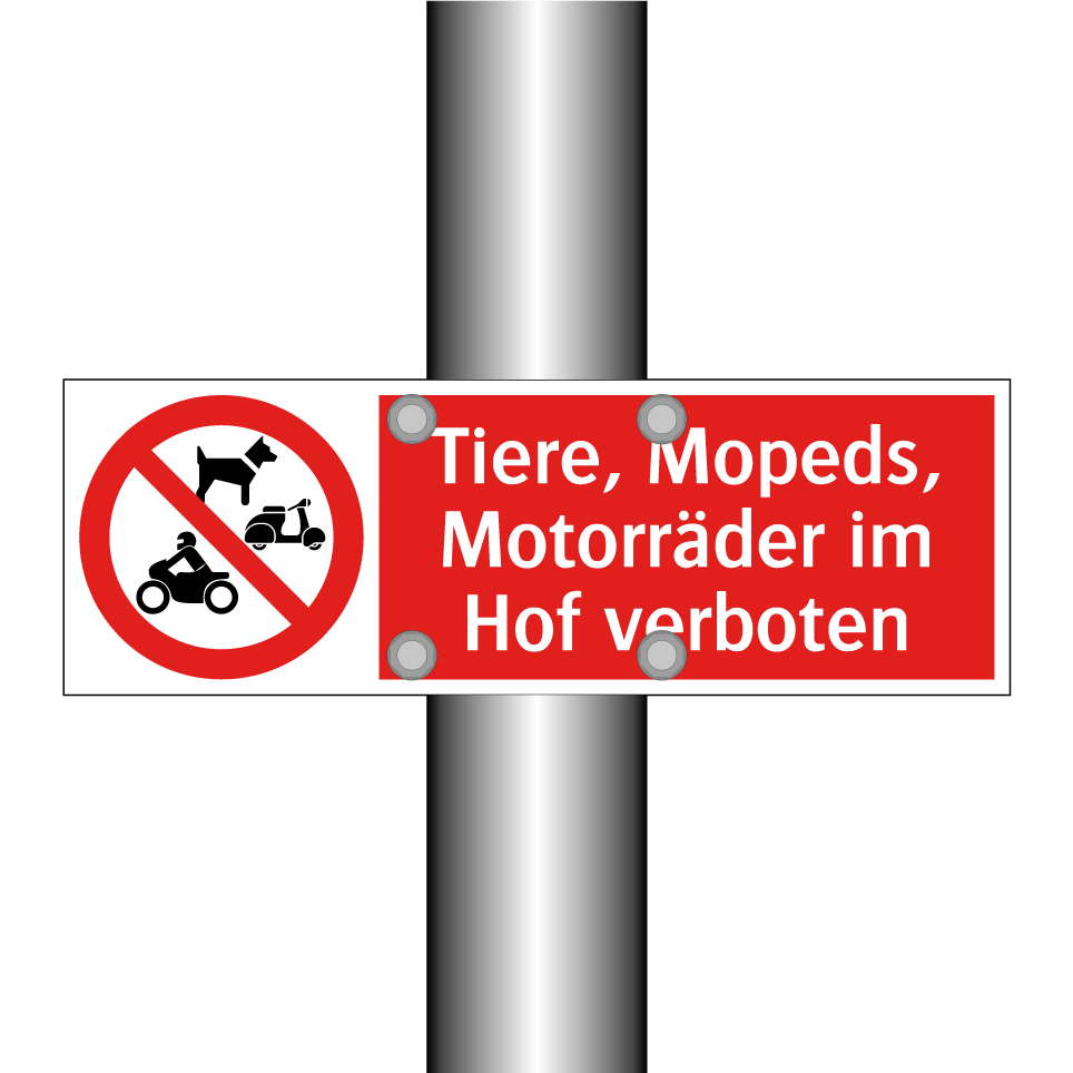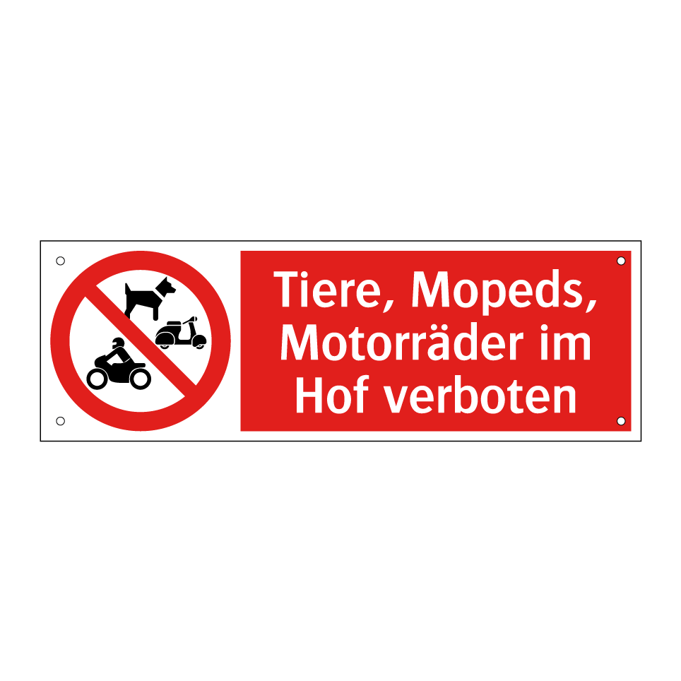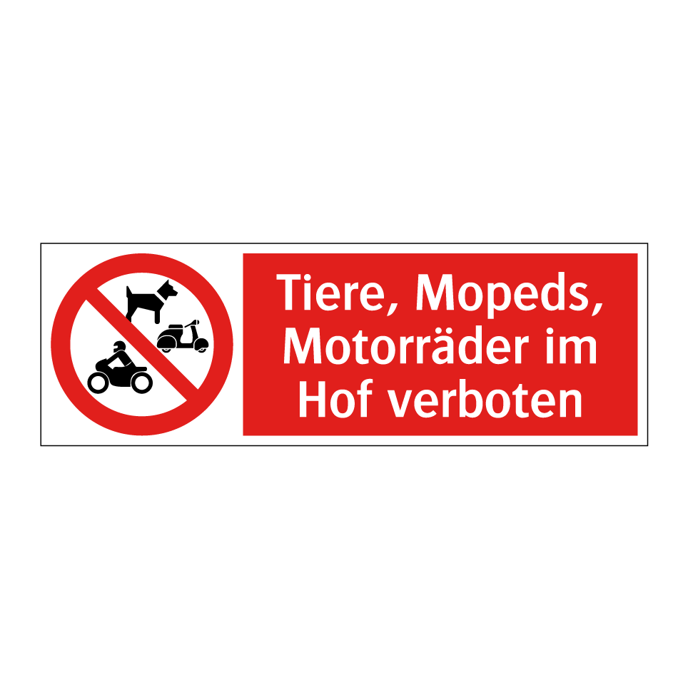 Verbotsschild mit dem Text Tiere, Mopeds, Motorräder im Hof verboten