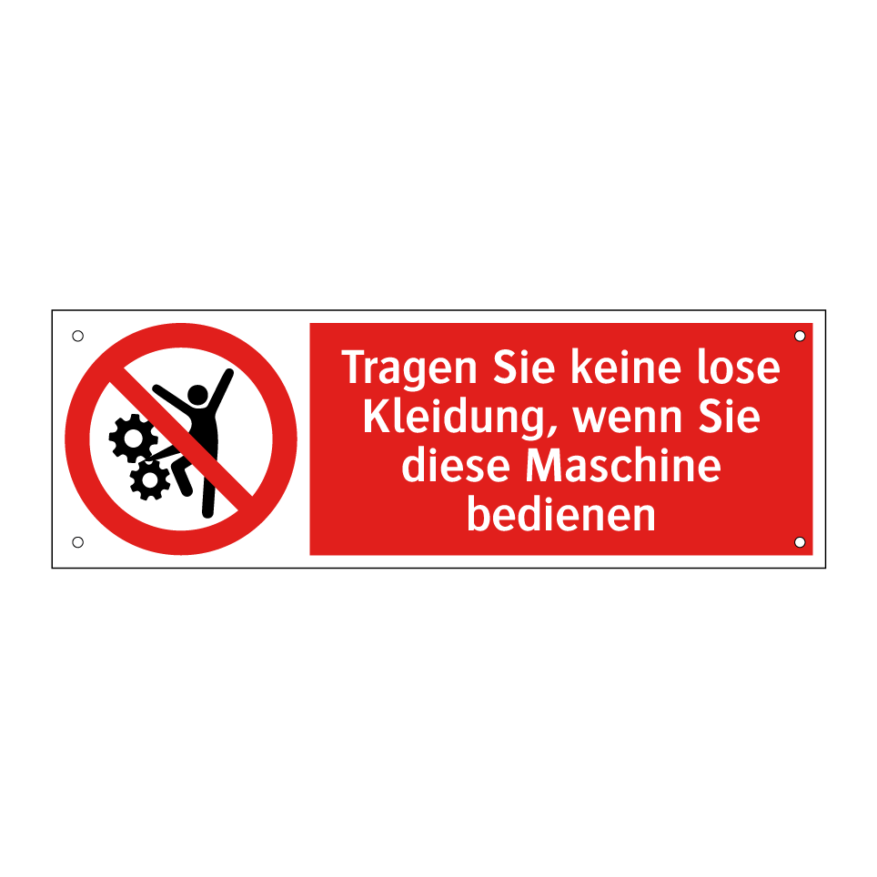 Verbotsschild mit dem Text Tragen Sie keine lose Kleidung, wenn Sie diese Maschine bedienen