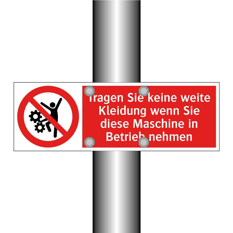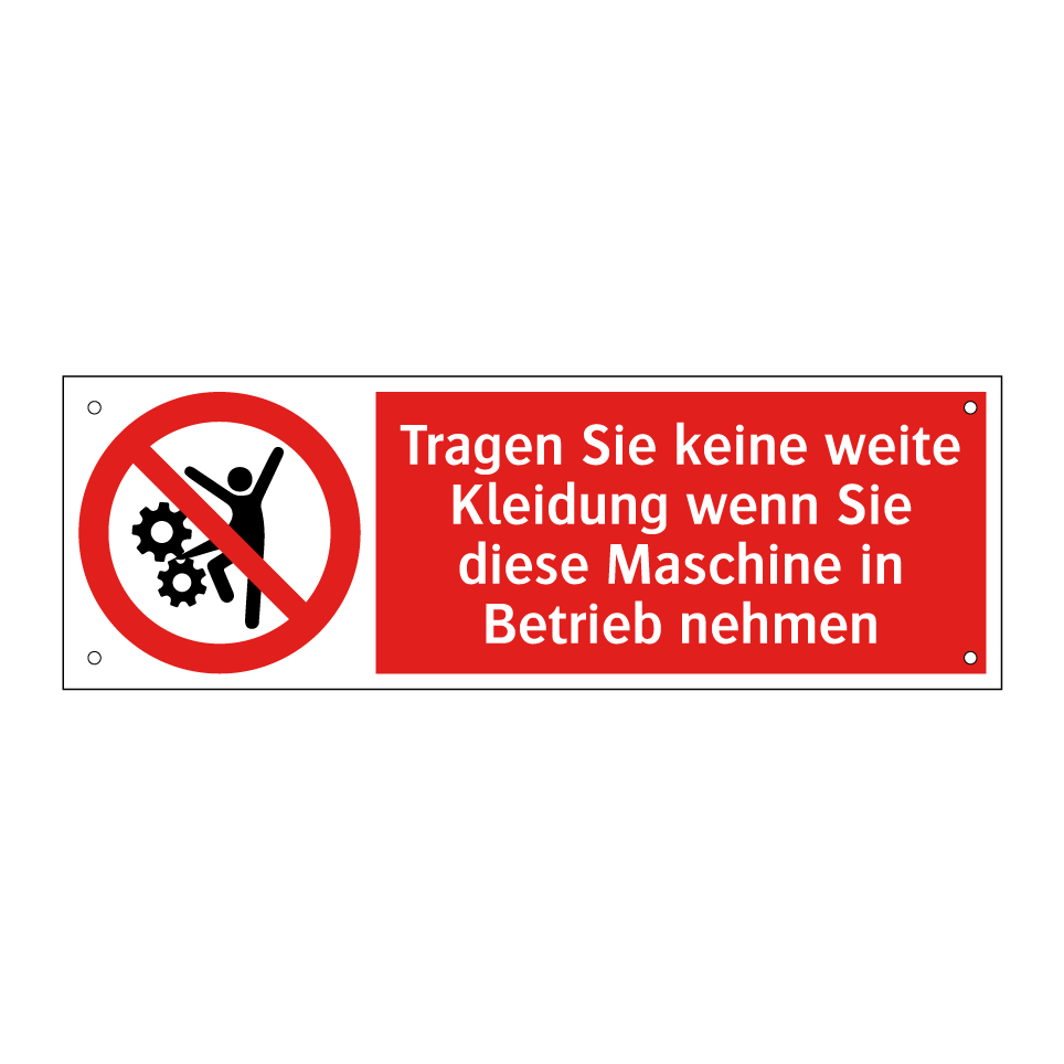 Verbotsschild mit dem Text Tragen Sie keine weite Kleidung wenn Sie diese Maschine in Betrieb nehmen