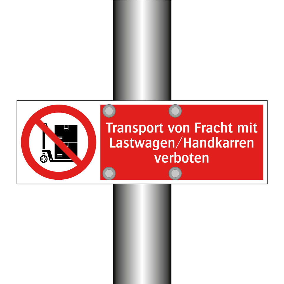 Verbotsschild mit dem Text Transport von Fracht mit Lastwagen/Handkarren verboten