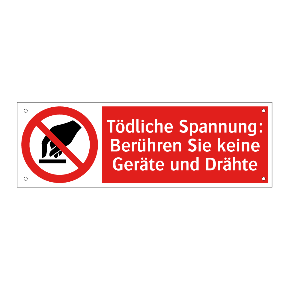 Verbotsschild mit dem Text Tödliche Spannung: Berühren Sie keine Geräte und Drähte