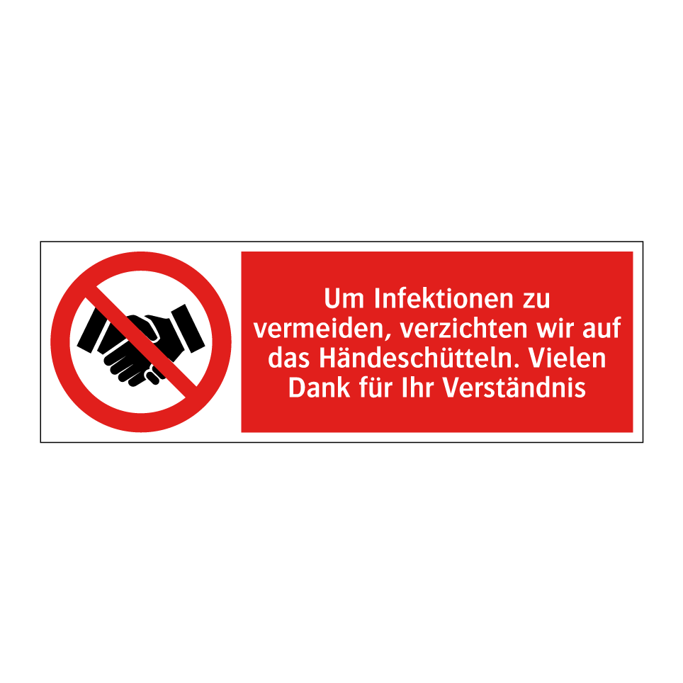 Verbotsschild mit dem Text Um Infektionen zu vermeiden, verzichten wir auf das Händeschütteln. Vielen Dank für Ihr Verständnis