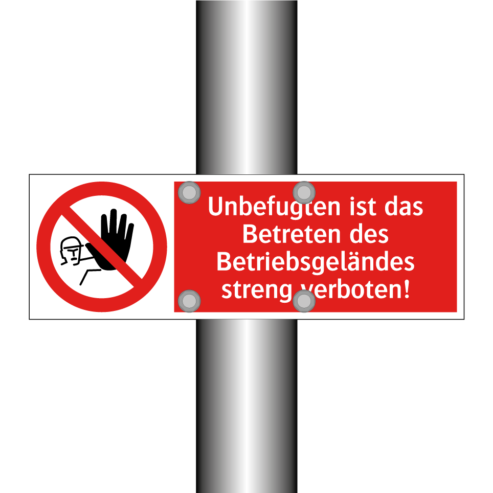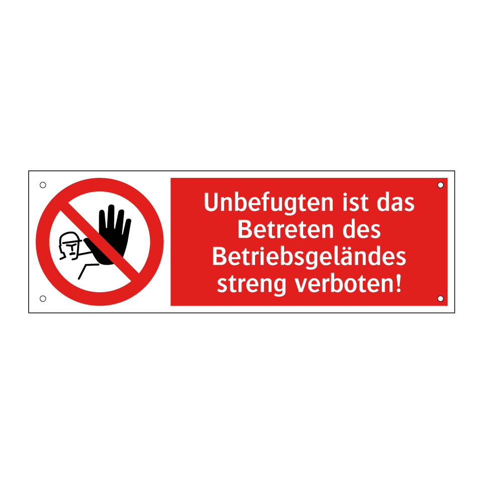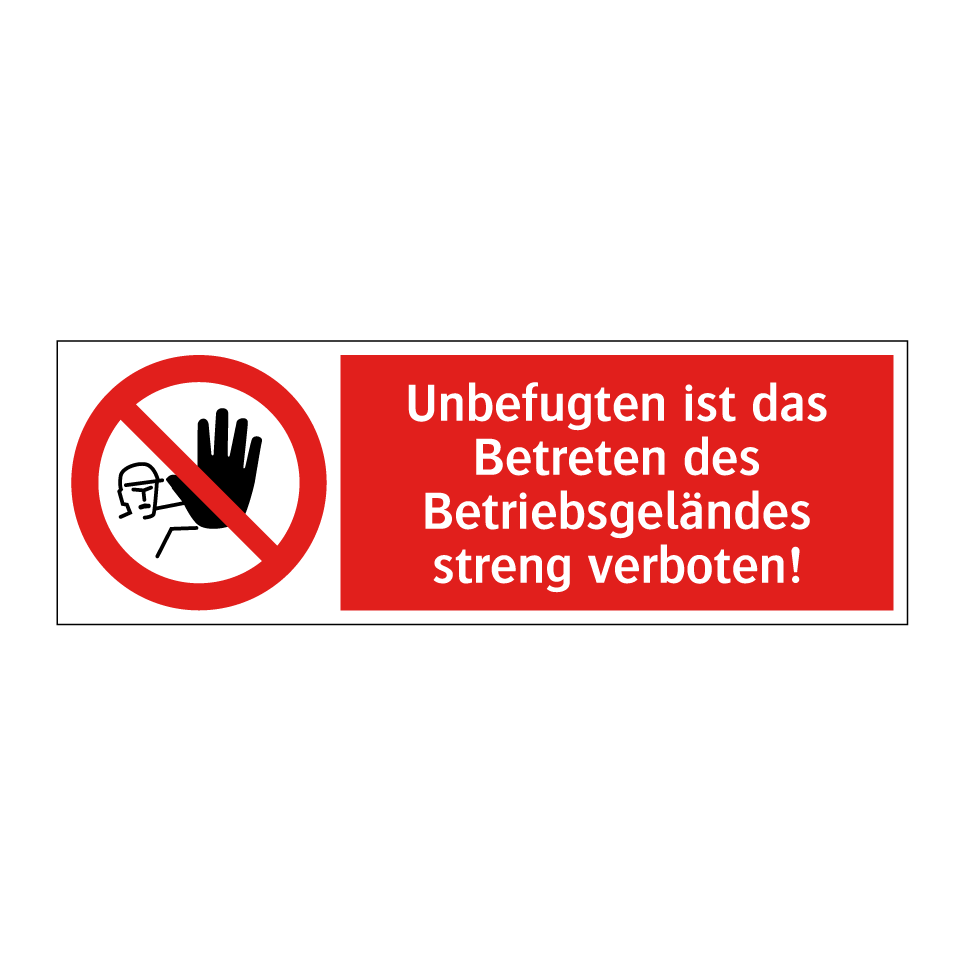 Verbotsschild mit dem Text Unbefugten ist das Betreten des Betriebsgeländes streng verboten!