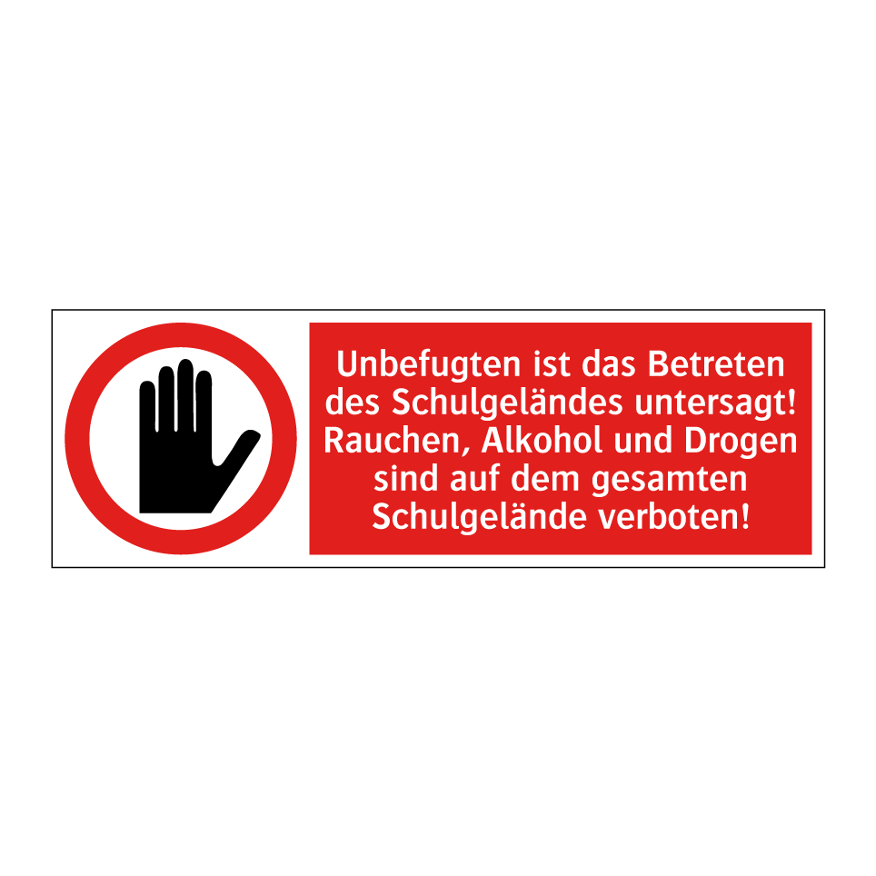 Verbotsschild mit dem Text Unbefugten ist das Betreten des Schulgeländes untersagt! Rauchen, Alkohol und Drogen sind auf dem gesamten Schulgelände verboten!