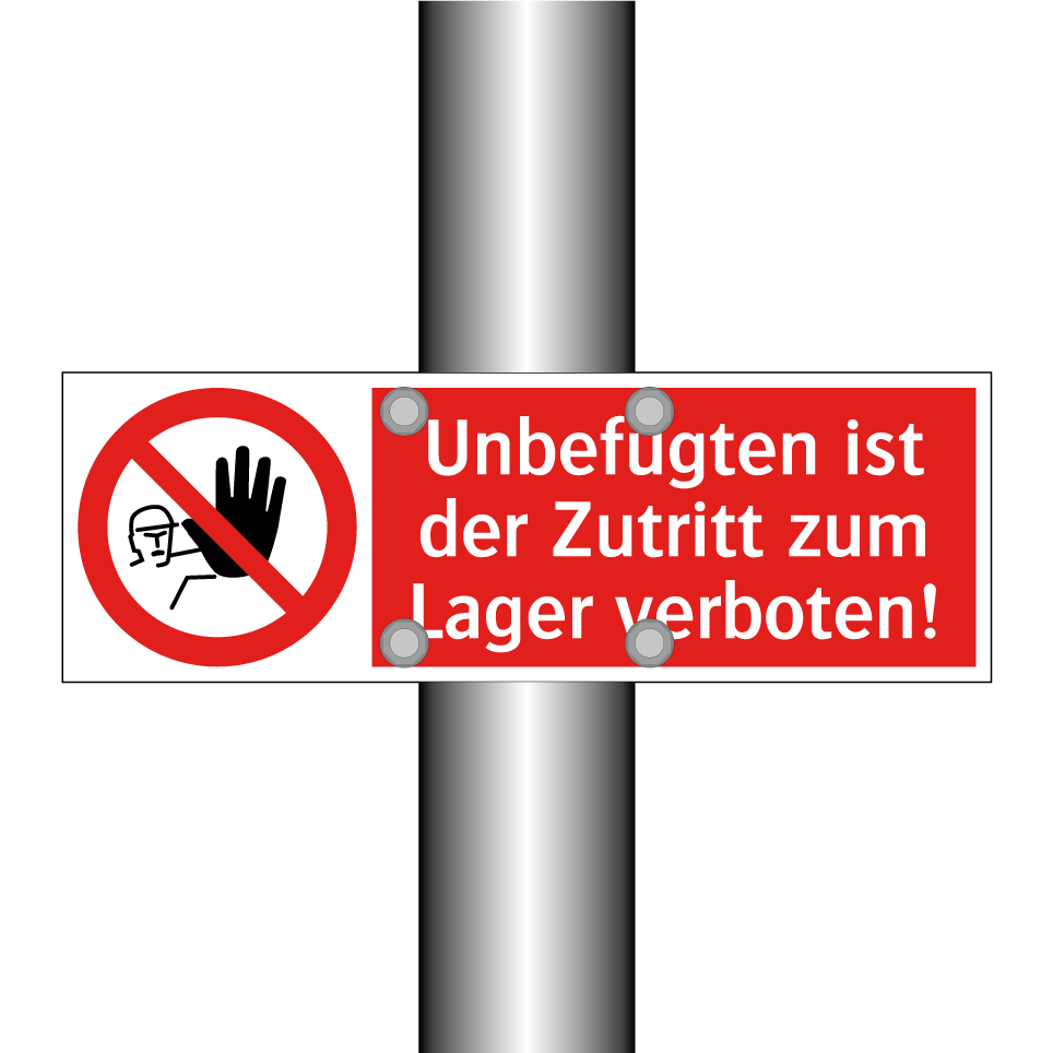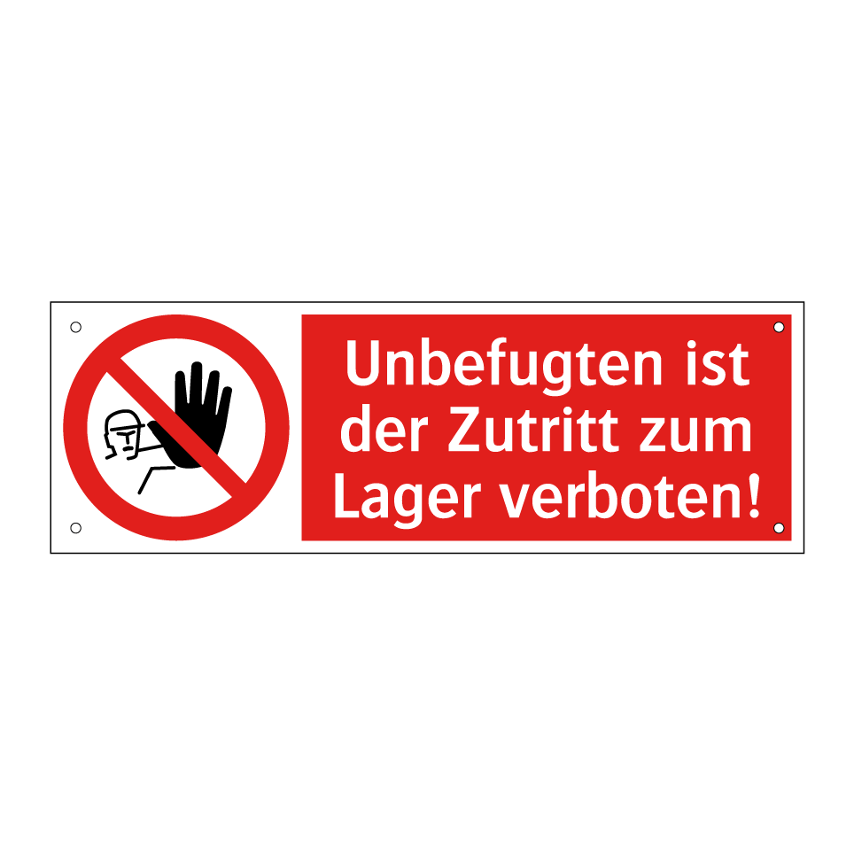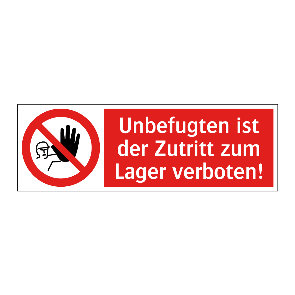 Verbotsschild mit dem Text Unbefugten ist der Zutritt zum Lager verboten!