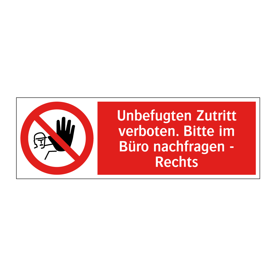 Verbotsschild mit dem Text Unbefugten Zutritt verboten. Bitte im Büro nachfragen - Rechts