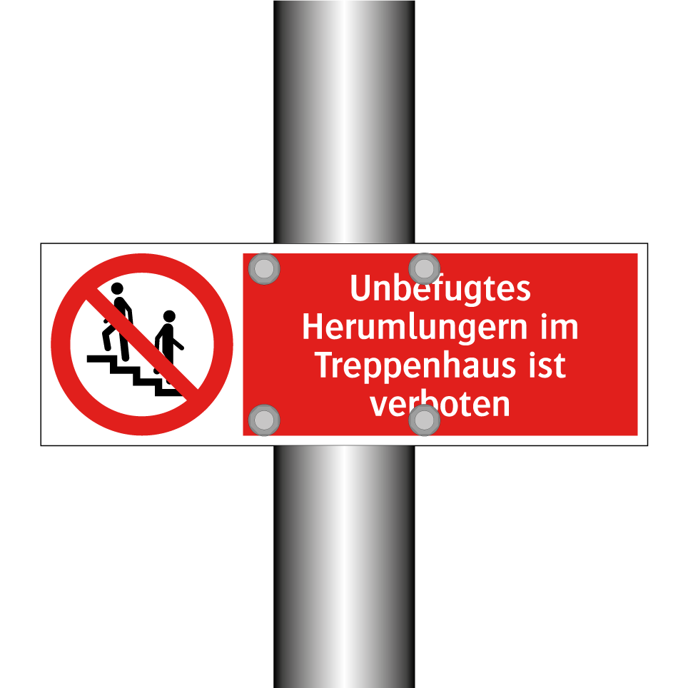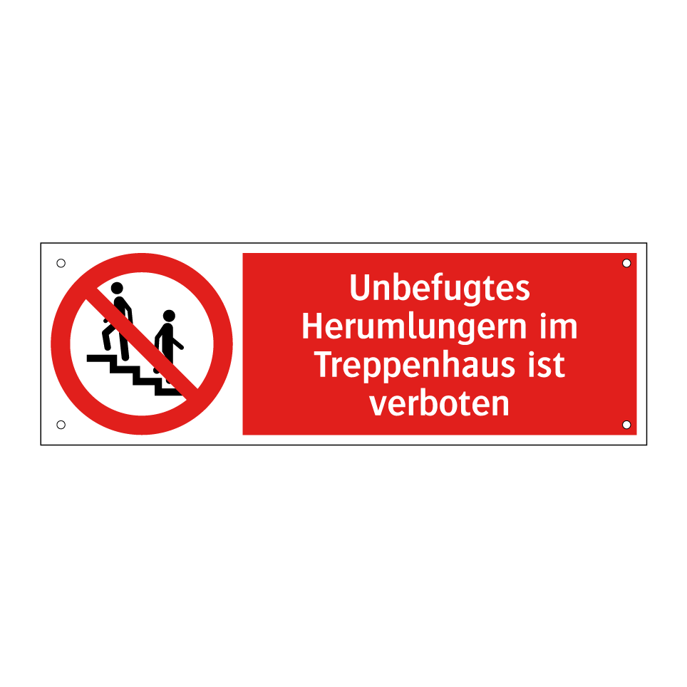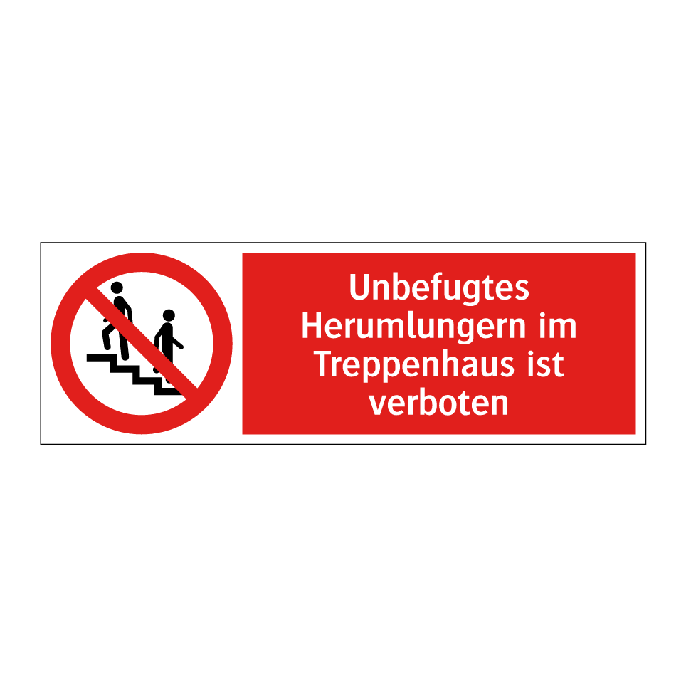 Verbotsschild mit dem Text Unbefugtes Herumlungern im Treppenhaus ist verboten