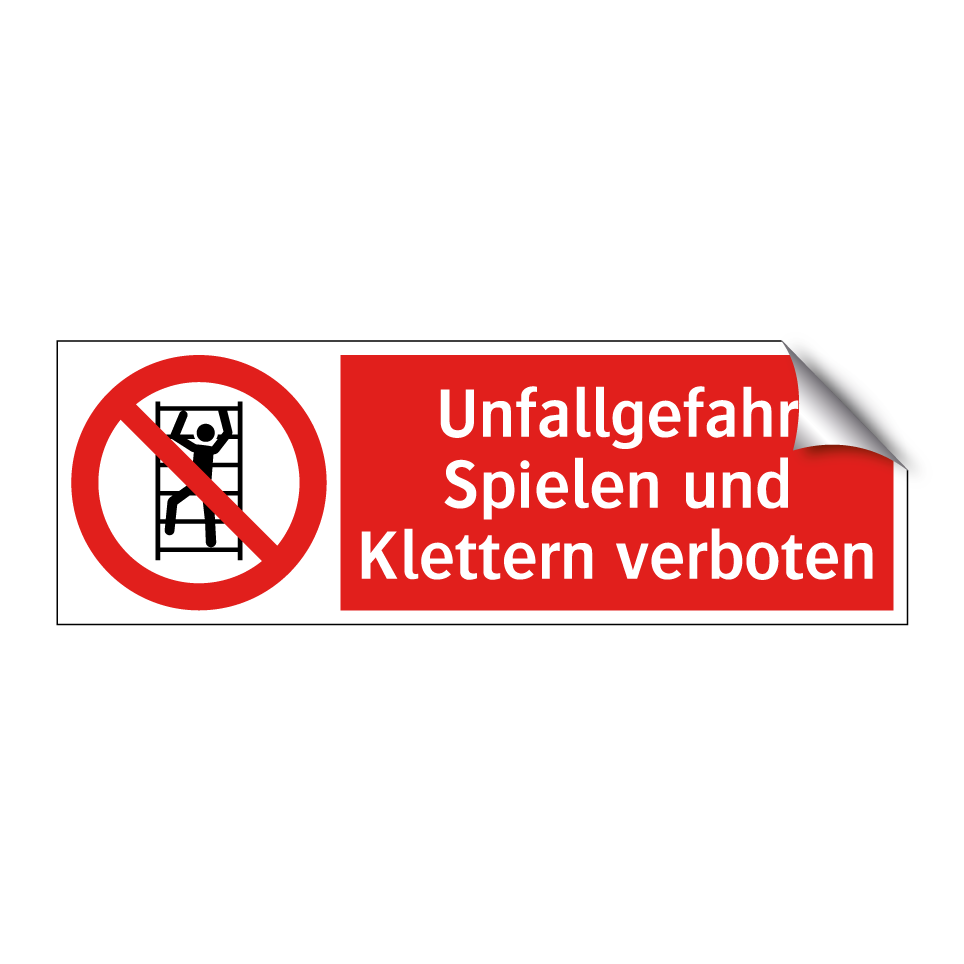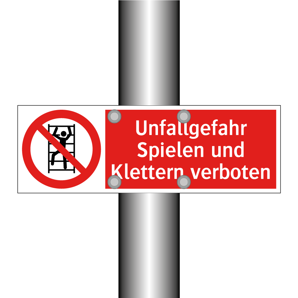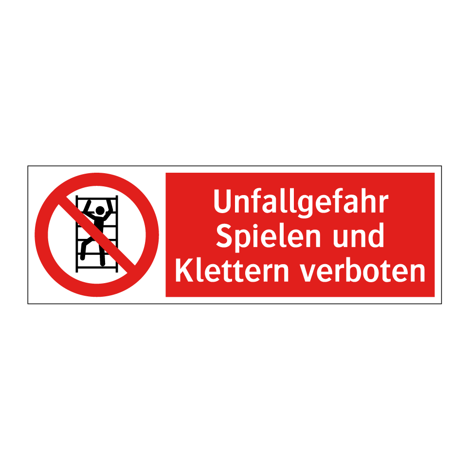 Verbotsschild mit dem Text Unfallgefahr Spielen und Klettern verboten