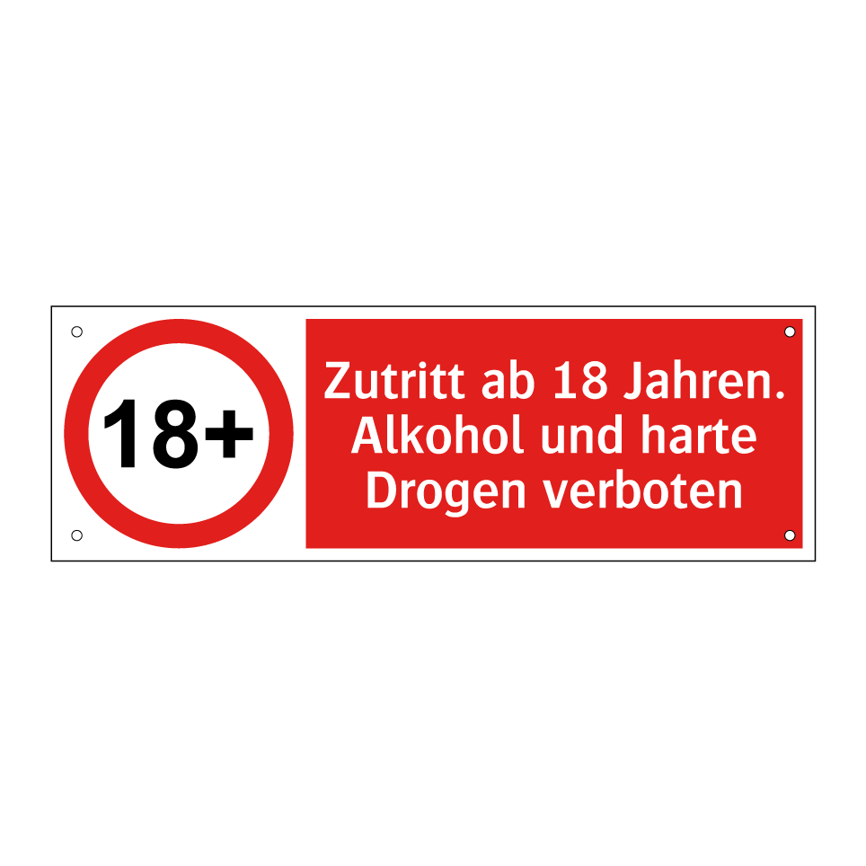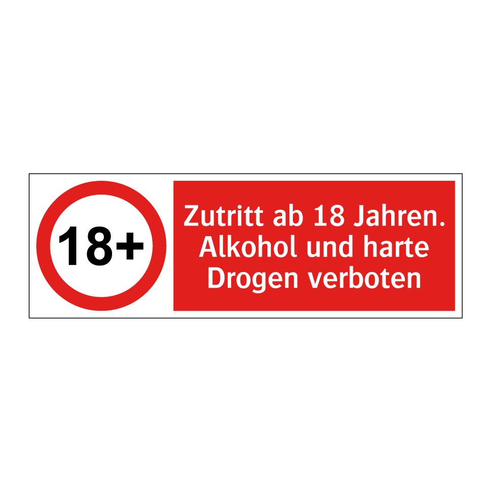 Verbotsschild mit dem Text Zutritt ab 18 Jahren. Alkohol und harte Drogen verboten