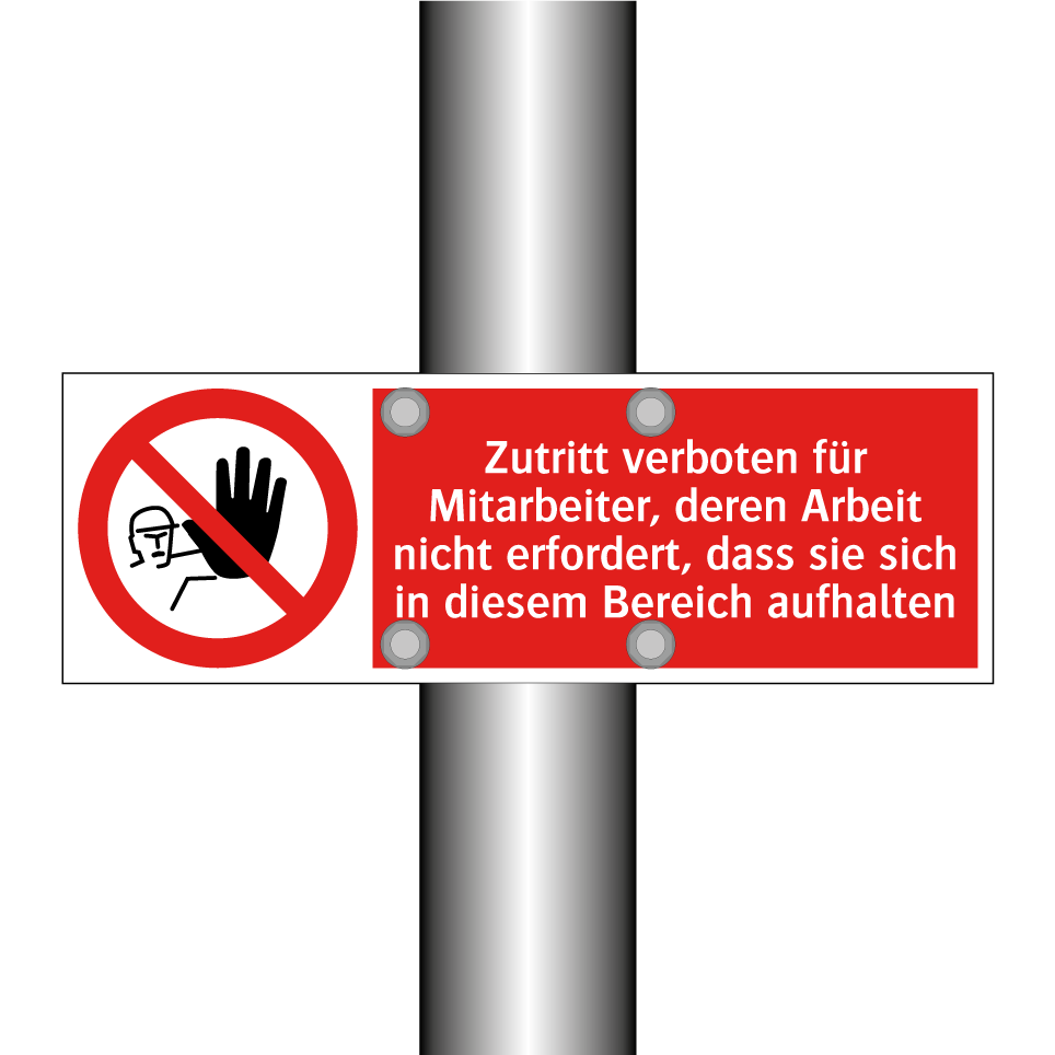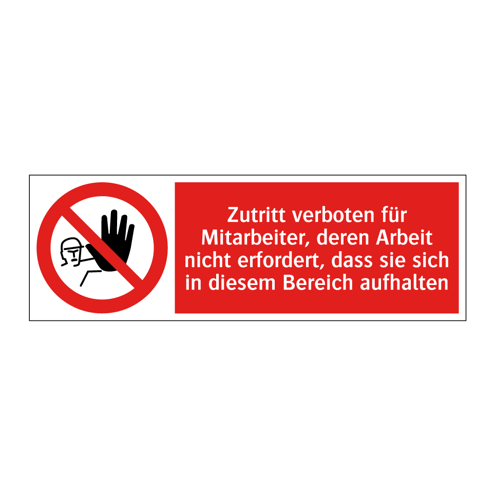 Verbotsschild mit dem Text Zutritt verboten für Mitarbeiter, deren Arbeit nicht erfordert, dass sie sich in diesem Bereich aufhalten