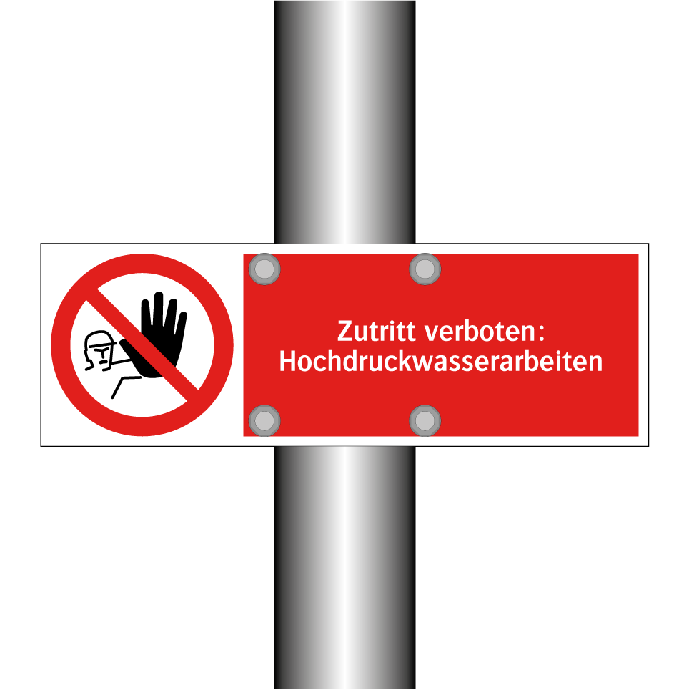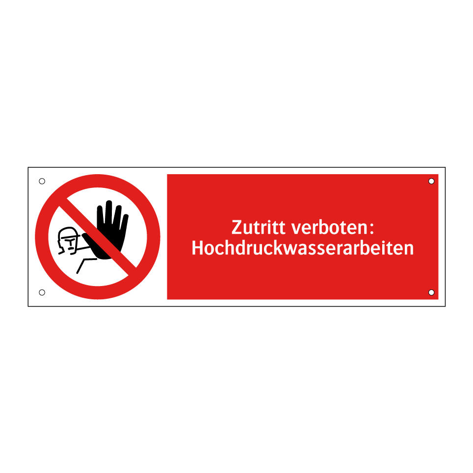 Verbotsschild mit dem Text Zutritt verboten: Hochdruckwasserarbeiten