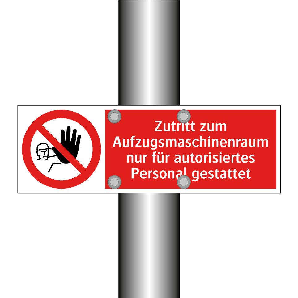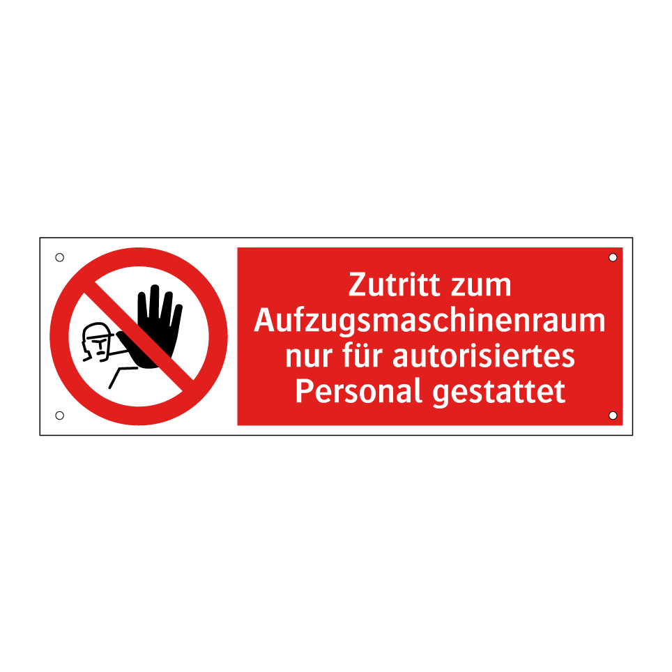 Verbotsschild mit dem Text Zutritt zum Aufzugsmaschinenraum nur für autorisiertes Personal gestattet