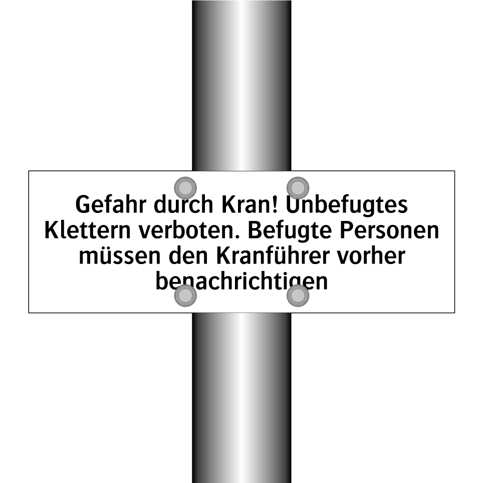 Verbotsschild mit dem Text Gefahr durch Kran! Unbefugtes Klettern verboten. Befugte Personen müssen den Kranführer vorher benachrichtigen