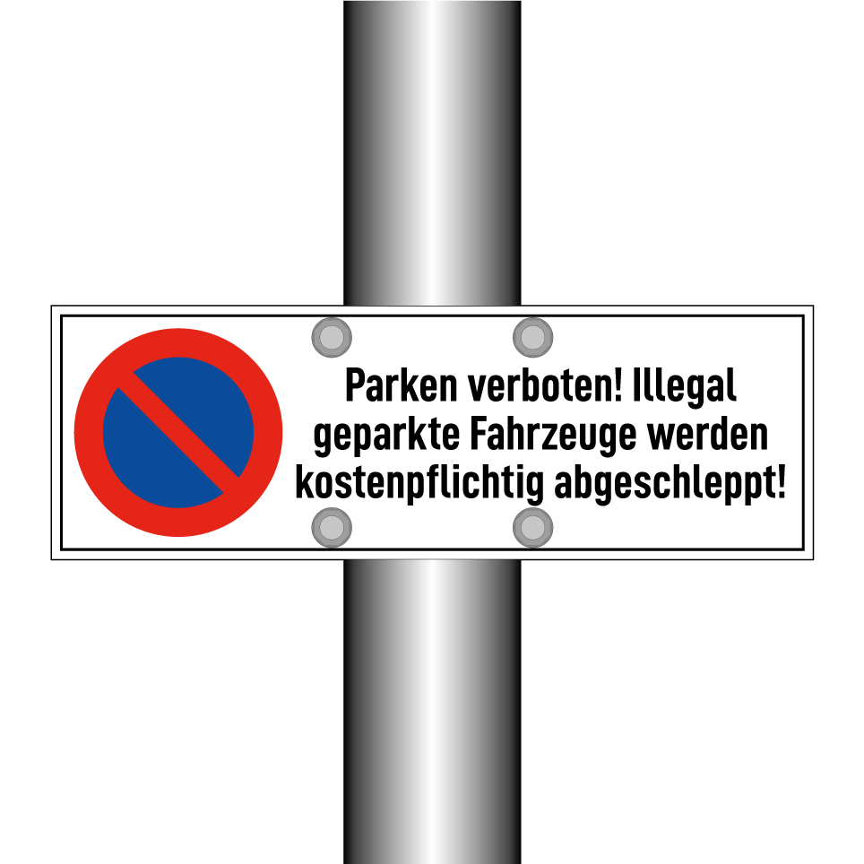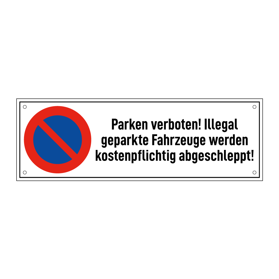 Parkverbotsschild mit dem Text Parken verboten! Illegal geparkte Fahrzeuge werden kostenpflichtig abgeschleppt!