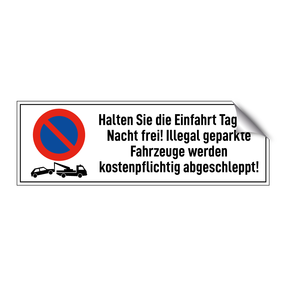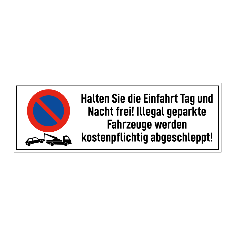 Parkverbotsschild mit dem Text Halten Sie die Einfahrt Tag und Nacht frei! Illegal geparkte Fahrzeuge werden kostenpflichtig abgeschleppt!
