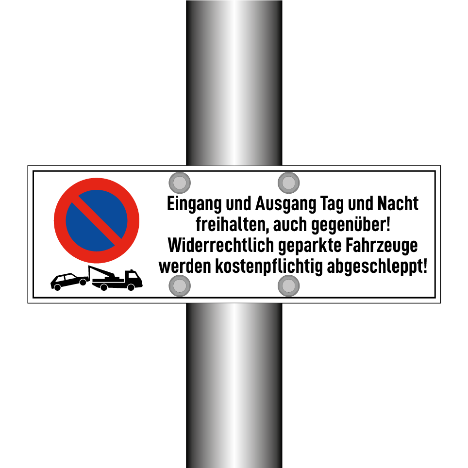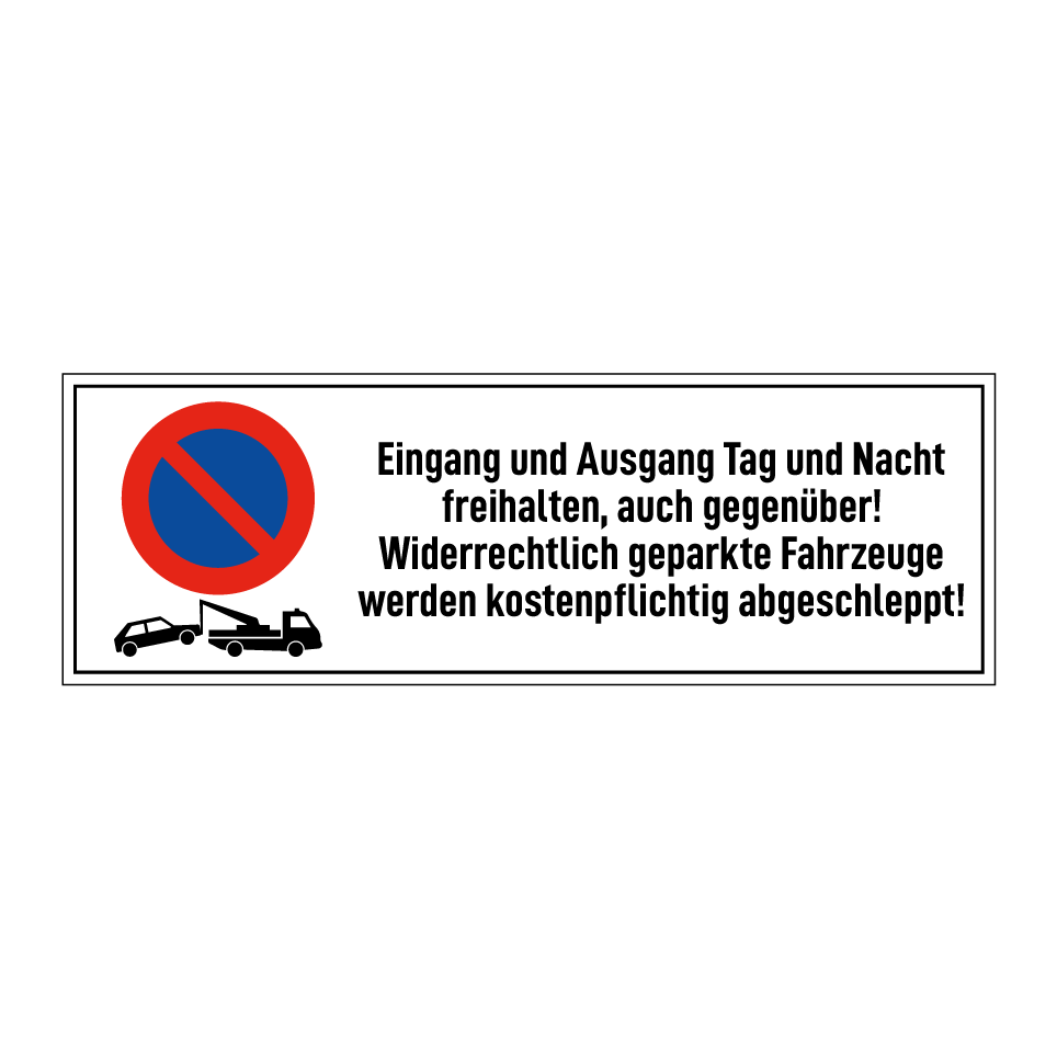 Parkverbotsschild mit dem Text Eingang und Ausgang Tag und Nacht freihalten, auch gegenüber! Widerrechtlich geparkte Fahrzeuge werden kostenpflichtig abgeschleppt!
