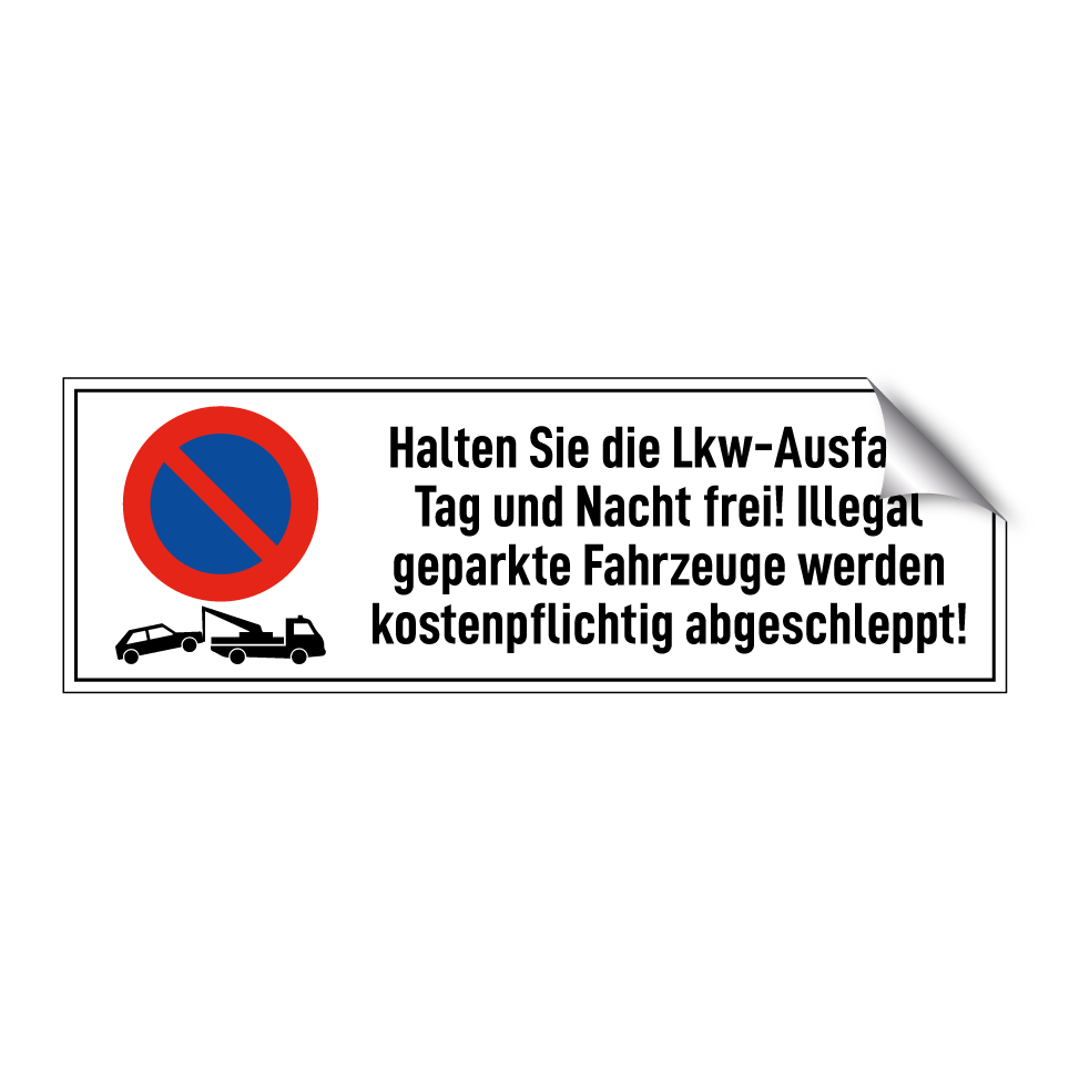 Parkverbotsschild mit dem Text Halten Sie die Lkw-Ausfahrt Tag und Nacht frei! Illegal geparkte Fahrzeuge werden kostenpflichtig abgeschleppt!