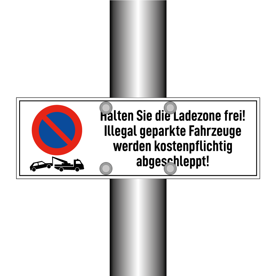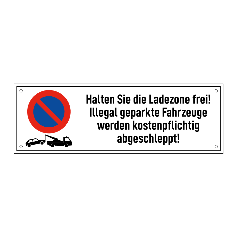 Parkverbotsschild mit dem Text Halten Sie die Ladezone frei! Illegal geparkte Fahrzeuge werden kostenpflichtig abgeschleppt!