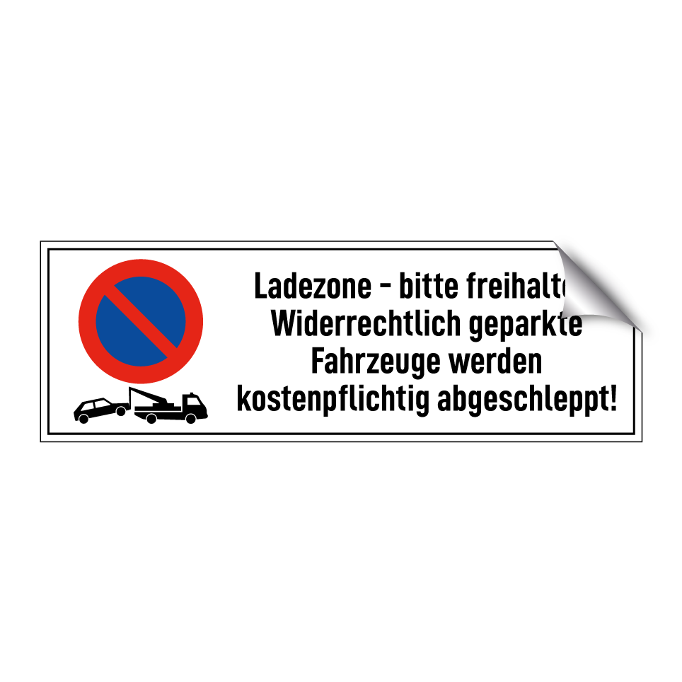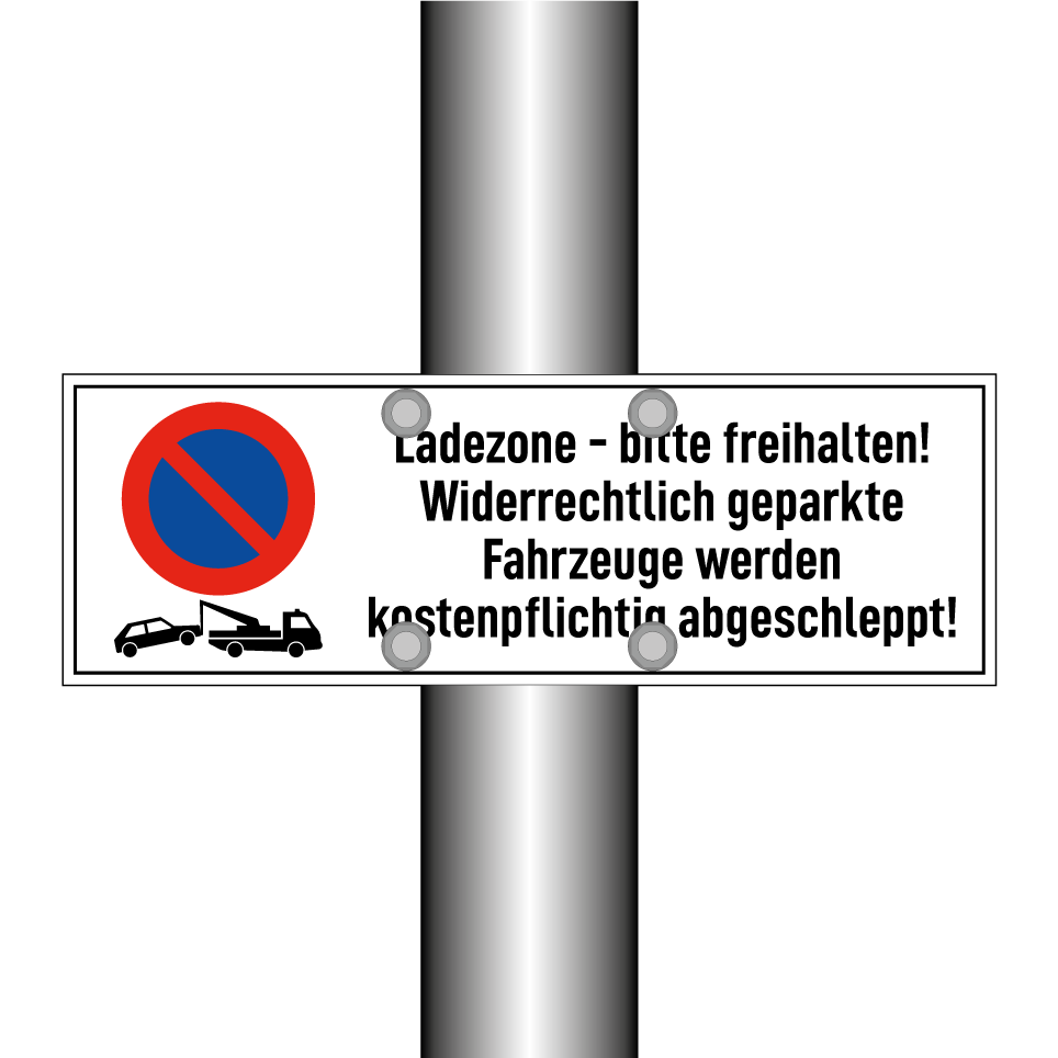 Parkverbotsschild mit dem Text Ladezone - bitte freihalten! Widerrechtlich geparkte Fahrzeuge werden kostenpflichtig abgeschleppt!