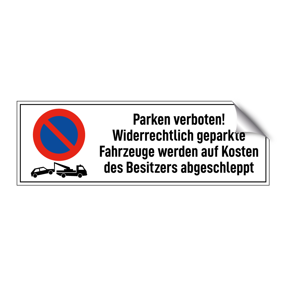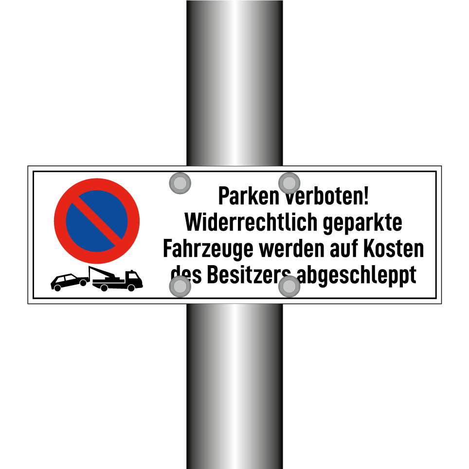 Parkverbotsschild mit dem Text Parken verboten! Widerrechtlich geparkte Fahrzeuge werden auf Kosten des Besitzers abgeschleppt